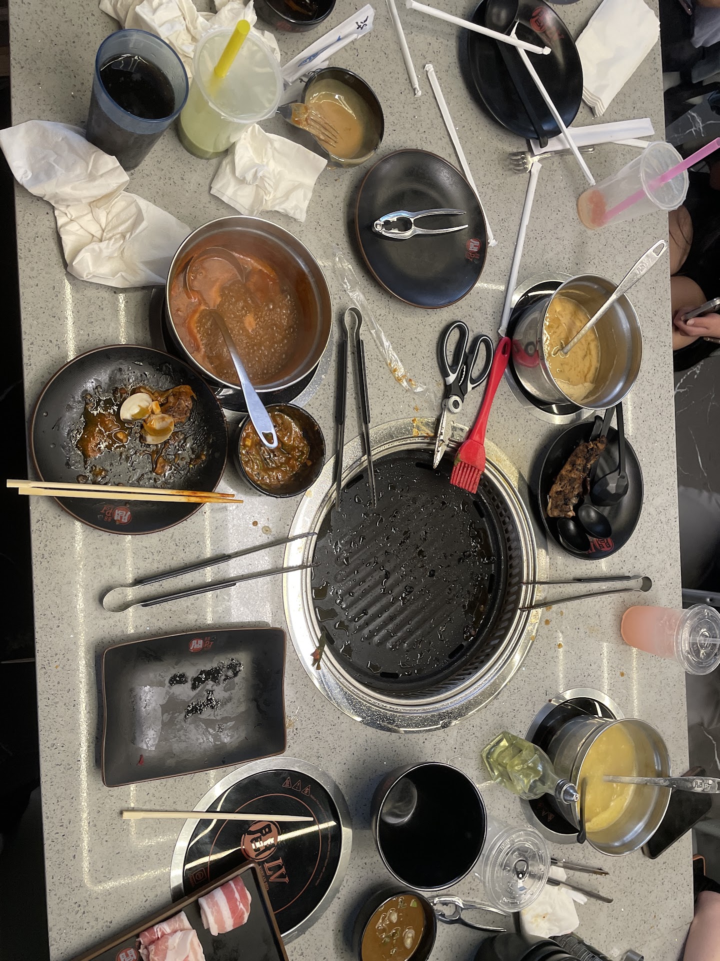 Service: Our service was not great. We had to ask for water refills every time, even after the waitress walked by and didn’t notice empty cups. The different food bars weren’t explained (e.g., “skewer only” label was unclear). We finished our meal except for the crab but had no crackers. The server finally brought some after we asked, but it should have been noticed earlier. Our BBQ was off/low and took a while to heat up after we requested it. Even after dessert, the BBQ was still on, charring residue, and we had to ask to turn it off. When we asked about food items, the response was often, “I’m not sure,” so we had to Google it. We were never told we could adjust our soup temperature. The server was present, asking how the food was multiple times, but lacked awareness to notice what needed attention. Water glasses were constantly refilled full of ice, leaving little room for water.