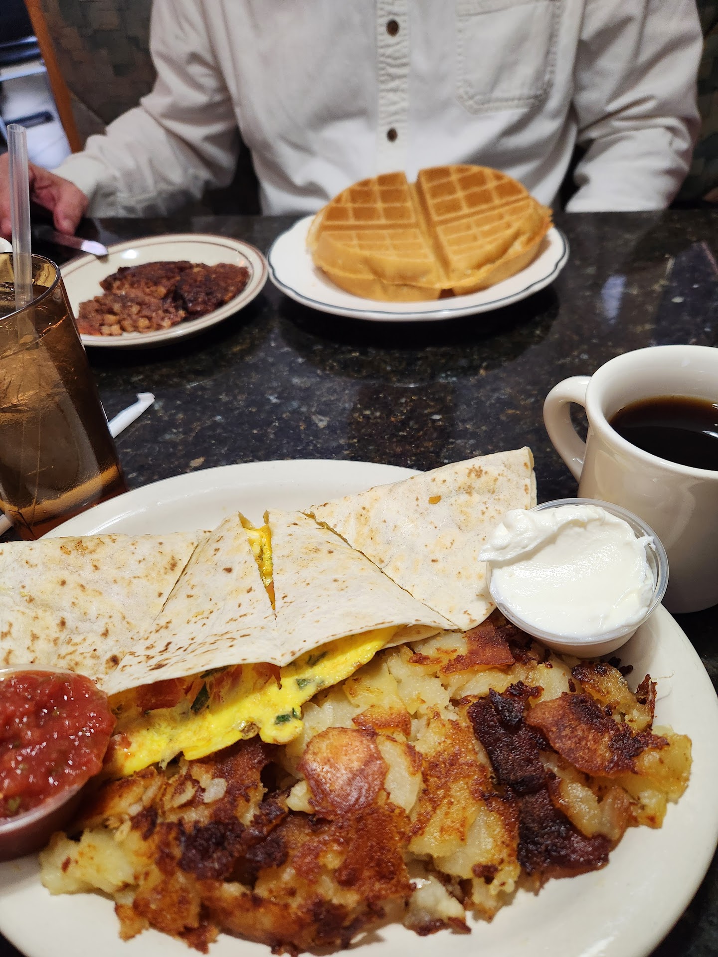 Read moreNostalgic. But not in a good way. This was a sad, bad trip back in time and space that the world forgot....and rightfully so. Horrible decor usually doesn't dictate food quality as there are plenty of dives with great food! The tip off though, should have been the almost empty parking lot. We ventured forth anyway thinking "How bad can a diner be?" We were in the area and wanted breakfast at 2pm, did a quick Google search for the closest diner and the reviews looked decent enough. Unfortunately everything went from bad to worse quick! From being seated almost in the bathroom for a place that was basically empty, to the old, plastic glass completely slit so water was pouring everywhere, to the driest, blandest overcooked omelet ever ever created. Our toast felt and looked like it was toasted- twice. Yep. It was bad. The server was nice enough though saving this...