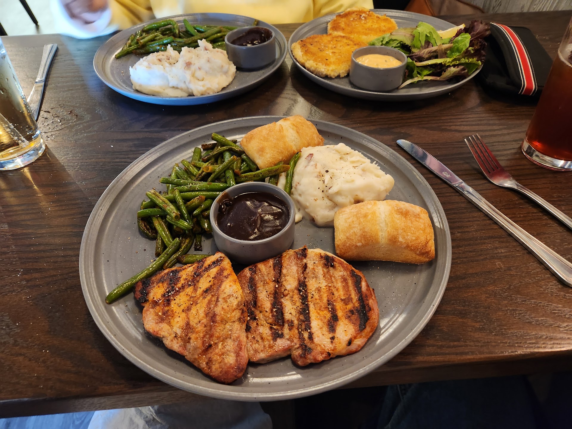 I chose boneless grilled Pork Chops (2) with Mashed Potato/gravy/with 2 dinner rolls, and green beans. I had unsweetened iced tea to drink. As we sipped our drinks and chatted about the bargains we found on our shopping expedition, I didn't keep an eye on the time, but we had no rush to go home, so it may have been a little while before our food arrived. Since the meals we ordered needed to be properly prepared, I would'nt expect them in 5 or 10 minutes as a fast food joint.