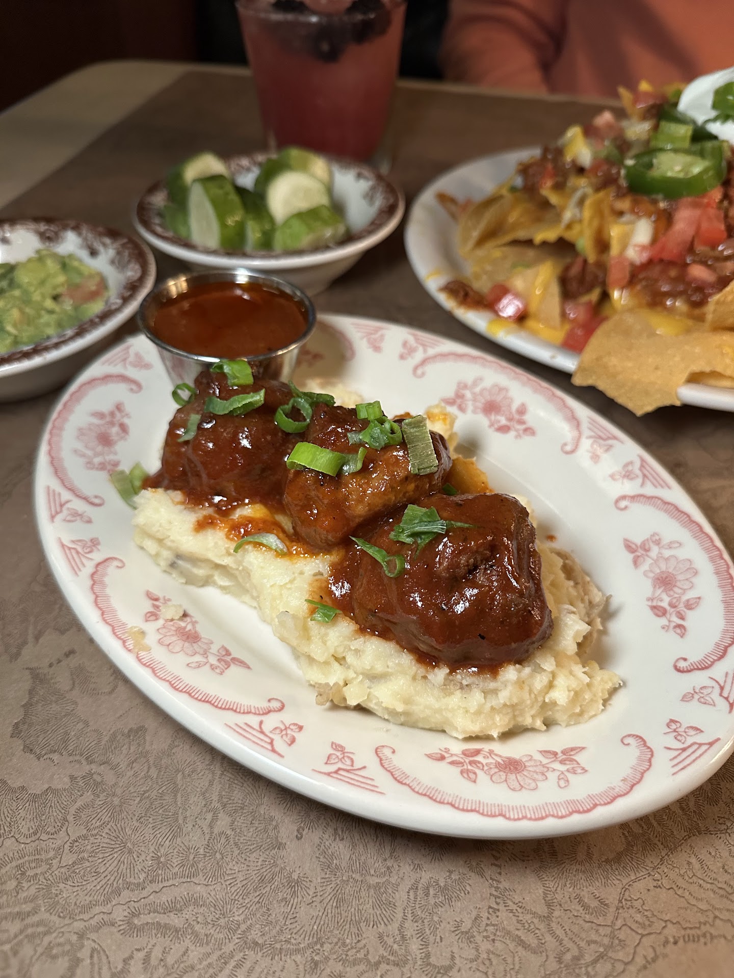 For food, we both ordered the bison brisket with parmesan roasted brocolli and onion rings. The bison brisket was basically pulled pot roast. I couldn't tell the difference between it and what I make at home with regular beef. The "parmesan roasted brocolli" was just steamed brocolli covered in grated parmesan and was nothing to write home about. They basically gave us each an entire head of brocolli which was a bit excessive. I would've rather had more onion rings. The onion rings were decent. No complaints there. Portions were also large enough to fill me up... and that takes a lot.