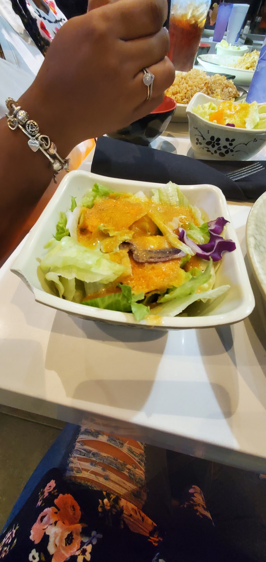 Read moreOk, so I went for someone's bday celebration and this was my first time here. HIGHLY disappointed! The best thing for you to do is order to go because the food is good. We sat down and the waitress asked us what would like to order to drink for now, water? I said yes, but I would like an alcoholic beverage, which I already knew what I wanted, but she cut me off saying, "I know, but would you like water?" I said yes, and then she still proceeded to the next person and did the same to them as if we could only order water for now. Then, they never returned to take our drink orders. So we went to the bar temporarily so we can get our own drinks. We ordered the drinks and that took another 30 minutes because the bartender was going in and out of the bar for some reason. Only to return and say, we have your orders, and your waitress will bring it to the table. So we went back to the table where we waited another 15min for her to return just to ask us what we would like to drink when the bartender already told us they have our drink orders and the waitress will bring it out. Keep in mind while all of this is going on, we still have yet to get the food we ordered, salad, soup, nothing! So we put in our drink orders again and waited. Waited another 15 minutes. At this point it is now an hour at the restaurant and we have not received drinks nor food. Only water. I had to wave my hand to flag my waitress down to remind her of our drinks that we see sitting at the bar waiting for retrieval. And my sister had to flag her down because we still hadn't received soup nor salad. Fast Forward, the hibachi chef came, he was nice but super quick and short. Like that's all 🤷🏾♀️. Anywho, the bathroom was horrendous..I.E I used a gas station bathroom instead. Then they mopped the floor towards the only exit and told everyone to be careful. It was puddles of water and we were all slipping to get out. Talk about a law suit waiting to happen. Like did you even squeeze the mop out?! Oh and my jack and coke tasted like a house whiskey so I sent that back. Safe to say I will never be returning. This needs addressing fast! And this was only a Tuesday , not a packed...