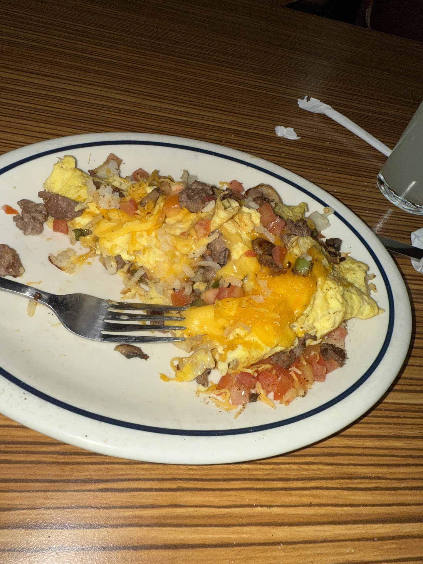 I wasn't greeted.. The manager (which I didn't know was the manager @ this time) was right there sitting on the waiting couches and didn't say anything to me.. The girls behind the counter were on their phones watching something together.. There were approx. 3-4 tables that weren't cleaned off by the time I got to my table.. By the time I left, they STILL weren't cleaned.. The waitress was super sweet.. I believe she was new.. She asked me what I wanted to drink.. I said "Hot Water." She brought it in a small kids cup because they didn't have the regular sized to-go cups.. I asked if she could use the coffee kettle and she kindly took it back and filled it, brought it to me and let me know she would be back to take my order.. The phone was ringing but never got answered.. She took a while to take my order.. When I gave her my order of the Veggie Omelet with no egg add green peppers & onions, she replied with a laugh sigh (ha), "you want an omelet with no egg?" I replied, "yes.." I asked for the cook to use my ingredients as I do @ every IHOP.. She kindly took my items and gave them to the cook.. Rude, ill-mannered Manager.. I over heard the male manager irately saying with an attitude, "No, no, no.. We not bout to do this.. Go get those and give it back to the customer.." She kindly came back and said we couldn't do it.. I said, "fine but could you have the cook not use any ingredients on my food, no oil, no salt, nothing?? She then went to the kitchen and informed the cook.. I realized that she didn't emphasize "nothing" when I said no ingredients so I hoped he wouldn't use butter.. I asked the manager that was walking by to reassure no butter was being used.. He gave me this look of discuss when I asked if he could make sure no butter was used on the food I ordered and he said, "what did you get?" I did reply with a smart comment of "I figured your kitchen would have the ticket so you can know what I ordered, but I ordered the Veggie Omelet with no egg add green peppers & onions.. He gave me this look of discuss again and then said, "so you want him to just burn it on the grill?" I said, "I asked for the sauteed not grilled.." He replies with, "it's all the same.." Baffled, I asked, "so you cook everything on the same grill??"