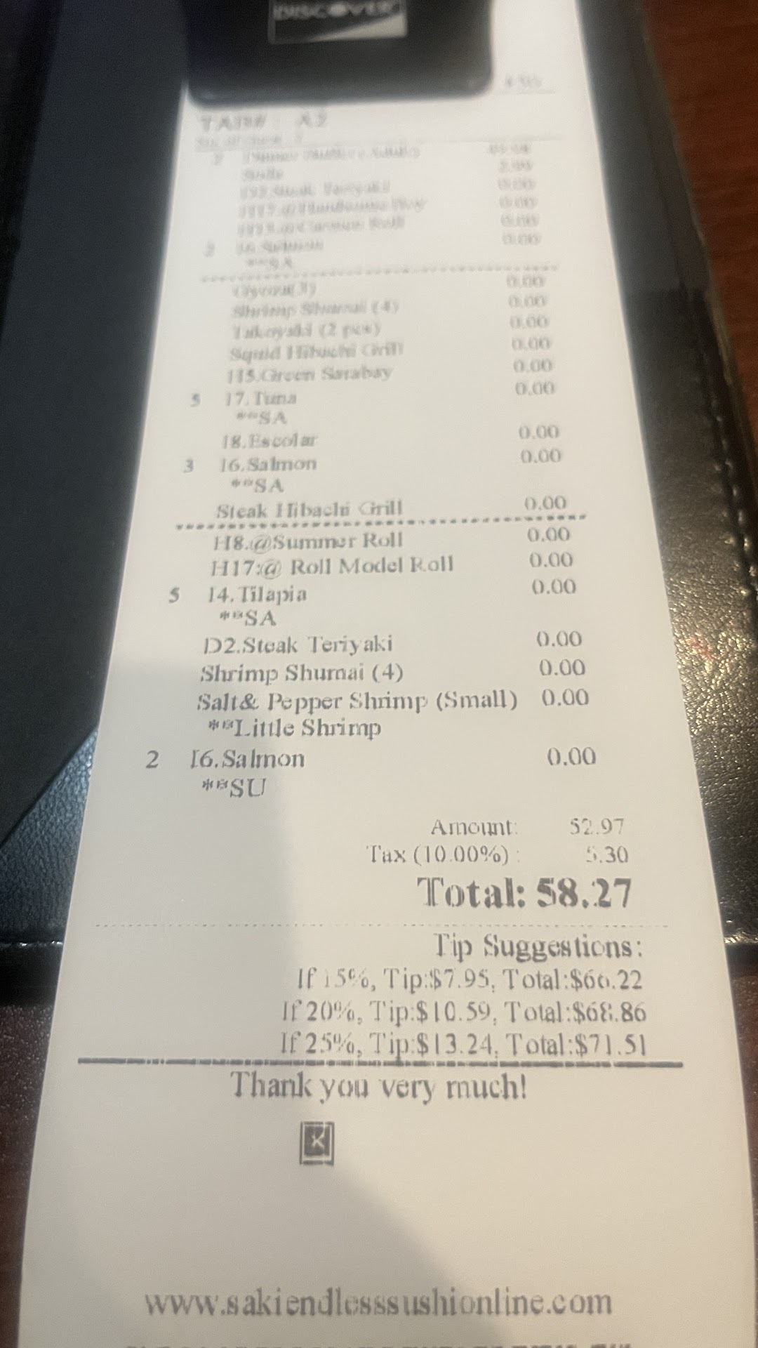 Read moreI was immediately seated upon entry but was not asked for a drink nor food order until 6 minutes of waiting. I ordered the dynamite roll and house salad w/ ginger dressing both of which were very tasty. I then ordered shrimp and chicken hibachi w/ fried rice and veggies. I wish my veggies were cooked to be more soft. The fried rice is good and I enjoyed the chicken although I didn’t care for the texture of the shrimp. The sauce that it’s cooked in makes you thirsty because of the salt content. I then ordered the steak and chicken hibachi w/ fried rice and no veggies. My first few pieces of steak were tough and the last was still breathing. I then ordered clear soup. My soup was delicious (forgot to get a picture) and so warming because it’s quite cold in here. I then ordered Krab Rangoon which was hot and yummy. Overall my review of the food is average and I would suggest cooking the meats for the hibachi longer so it browns and cooks completely thru. It is very likely I won’t be patronizing here again my total was $20.44 I left $25 (additional tip for...