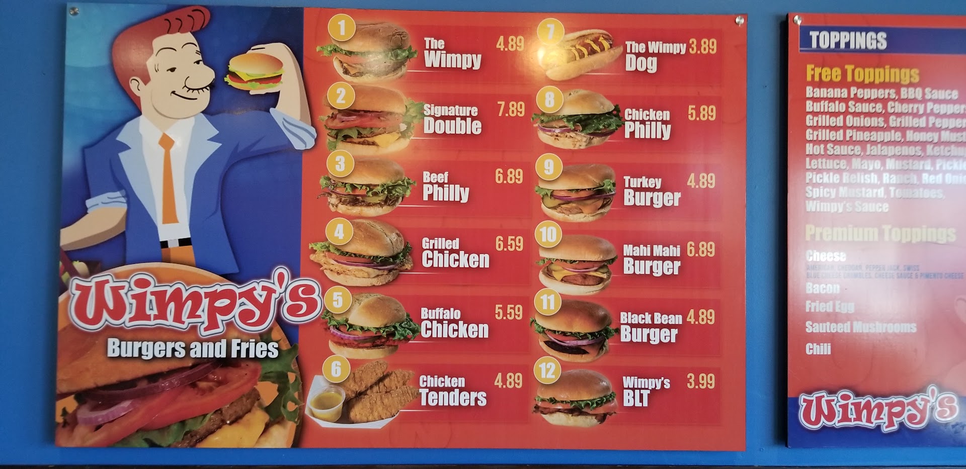 Read moreThere is certainly plenty of choices in Olive Branch / Southaven area for Buger Shops one step up from chain Fast Food, from Rapid Service to Full Service and new ones open all the time (Wayback Burgers is the latest in O.B.). So why Wimpy's over others like 5 Guys or The Sear Shack? Well, Wimpy's have been around longer than most, they are still quite popular, and they have good, consistent Food and Service. Their Burgers are gigantic, fresh meat pressed on flat grill, more reasonably priced than most and 100% customizable with a wide variety of toppings. Come hungry for sure! Today I tried the Signature Double (#2) and it was almost too big for a traditional after- church luncheon. Friendly and fast service on a busy day, all good.... well, almost. Took off a star off this review because my hot and generous portion of Fries vaguely tasted like Fish. Thing is, they also offer Fried Catfish now, a recent addition to their menu, and they probably have not added a dedicated fryer, not cool. Never fry seafood in the same oil as French Fries or Chicken Tenders. A basic rule... Today, it was my only major complaint on an otherwise great Burger Joint. Minor detail: hard to park when busy, not many spaces available...