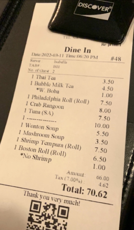 Read moreAt first my friend and I liked the place, the menu has a variety of dishes, and I was exited to try their boba! But unfortunately our waitress couldn’t pass the message about product substitution to the kitchen. That was alright and after we asked her to fix it she did by bringing the missing ingredient. I loved the wonton soup, crab ragoons were also delicious! At the end of our meal we saw an undefined $10 position… picture attached.. also wondered what is that for, she said “oh I’m sorry that happens sometimes” please fix your register so THAT doesn’t...