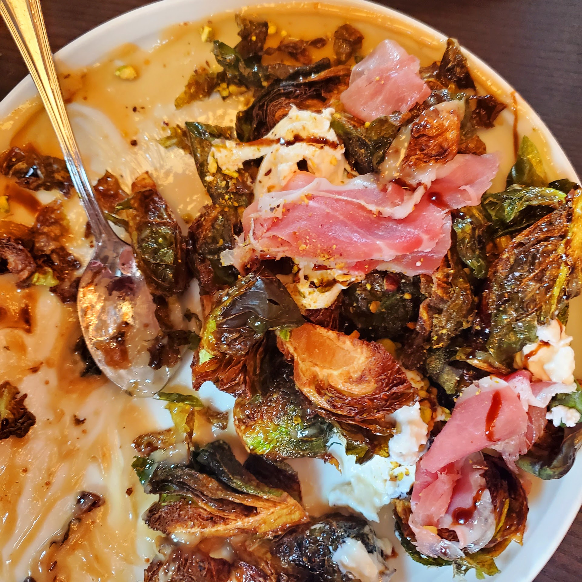 Its a neapolitana style pie wa splash of ny style in there, overall I was a fan of the concept....a quality spicy gabagool, garlic sauce, shaved brussels caramelized onions and the fontina all worked as fantastic flavors and the crust uses quality 00 flour but where things fall is in ratio and bake off... the pie was to top heavy and either the crust too thin or under done. It was a fork&knife job. Fairly common for this style of pie. All n all still pretty decent but could be...