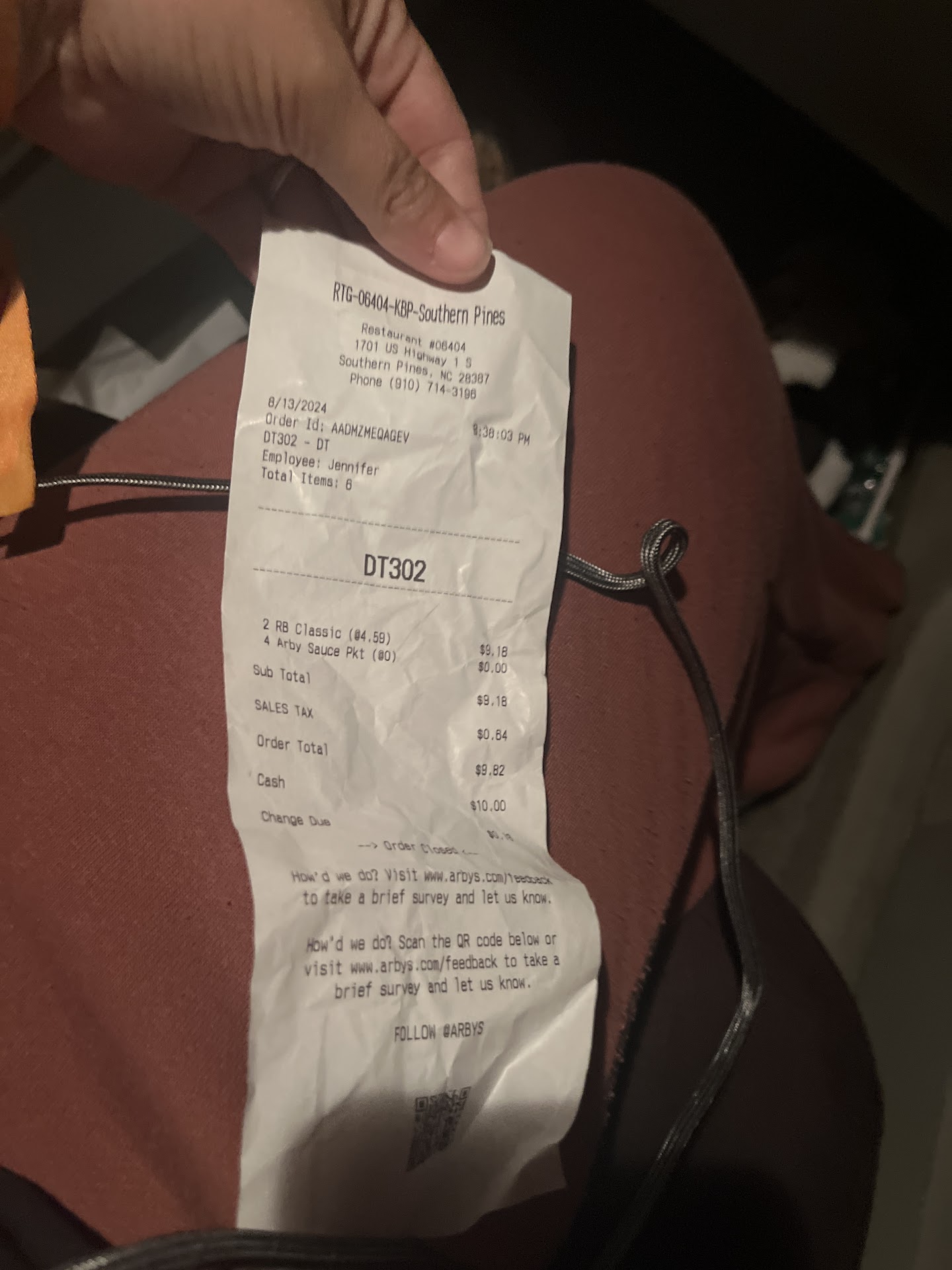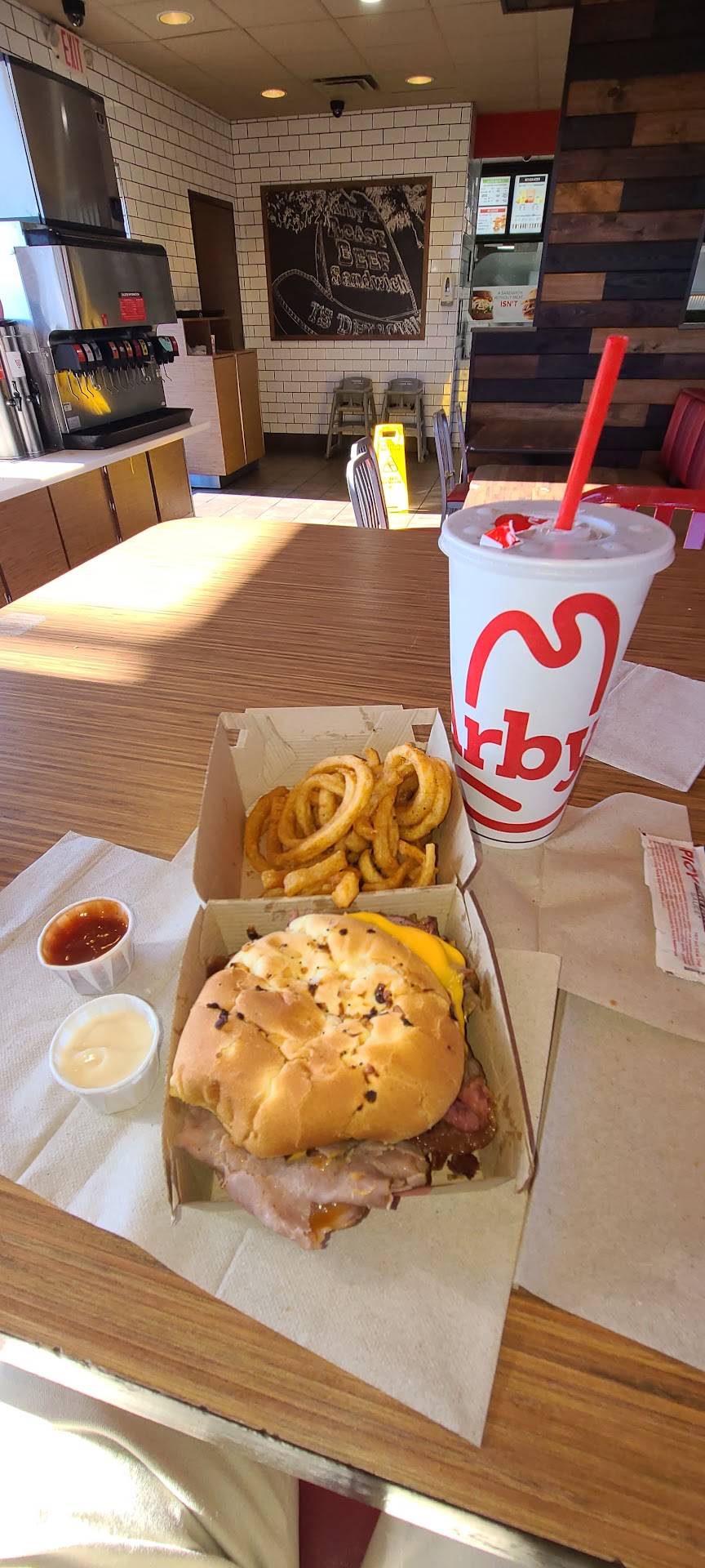 Read moreI haven't been to an Arbys in a Long Time! Years ago Arbys was a Fav of my for they're Roast Beef! I must pass by this Location is on a Corner of a Bizzy Intersection, on Old Rte1 All the Time on way to Wal-Mart or Lowes, or were ever but with all the Bushes, Trees and a Arbys Sign is so Small on the Corner, I didn't even think of Arbys as a choice to stop grab a Lunch or early Dinner on way home! But Monday, two Lovely Friends invited me to meet at Arbys for a Late Lunch! I even had to Google the Location! But, I was very Pleasantly Suprised when we all went in, how nice, neat & clean Arbys was! Very helpful Staff answered questions about Menu! Was pleasantly Suprised by the Arbys Menu, there were so many great looking choices, Fish Basket, Prime Rib Steak Sandwich (my choice) they even kept off the peppers for me, added Curly Fries & Lemonaide $9! My Friends chose the Gryros 2 for $7 and Shakes! Everything served at good Temps to eat, we all enjoyed our meals and are looking forward to trying other things on the Menu another Time, like Brisket on a Roll looked good, and Next Time I'll include Photos!...