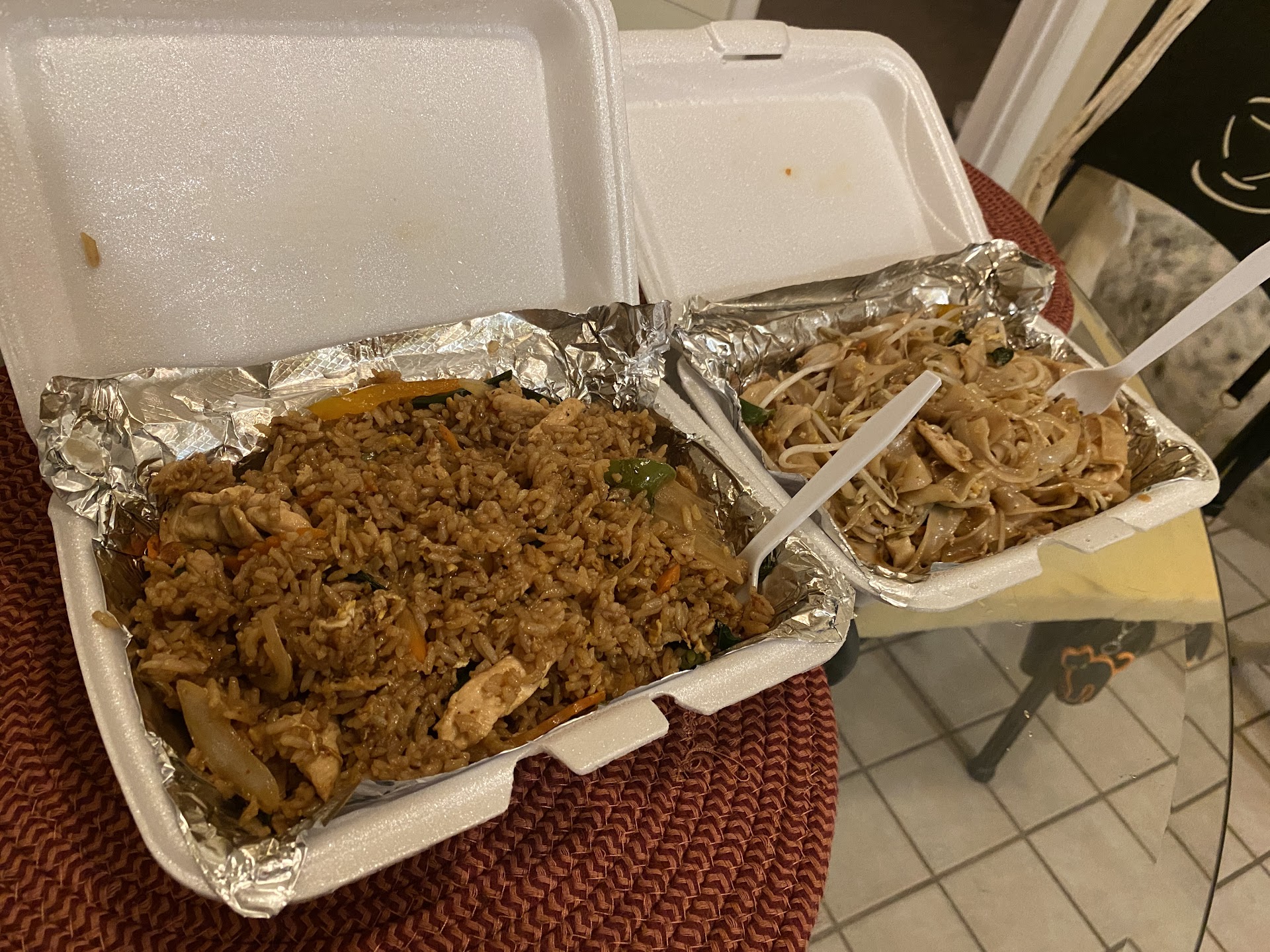 I've steered clear of this place for years because it never lured me in. It looks like a very typical, semi run down plaza restaurant. They have no dining-in despite having many tables. It's decent inside but feel abandoned (ceiling tiles show water staining/rust); perhaps its a staffing issues. Not sure. I've reviewed other similar type of Thai restaurants, which I thought I would have disappointed, but was blown away with quality. For this place and the one dish that I sampled I felt it was about on par with a typical shopping mall's food court. You know, perfectly fine, but you're not writing home about it or intently recommending it. I happen to pass by this place because it was close and hungry.