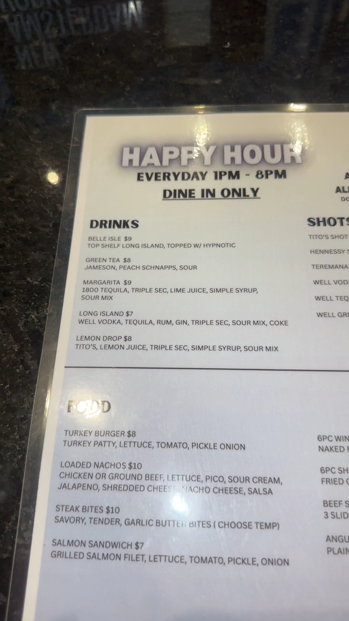 We ordered burgers, which were just okay, but the happy hour margarita was extremely watered down. The happy hour menu just said “margarita,” so when I asked for a strawberry version, I got charged full price anyway. On top of that, they automatically add gratuity to your bill and then hand you another slip to leave an additional tip which feels really shady.