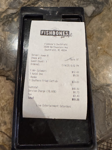She never apologized or admitted her fault in the situation. The seniors would've had a nice afternoon lunch if it weren't for her drama. She needs to find a different profession away for dealing with customers because she didn't demonstrate customer service AT ALL!!! I will never eat at the Southfield Fishbones again!!! From the manager to the waitress, customer service was not present. So sorry that the seniors had to experience the whole ordeal when it was unnecessary. So sad....especially since the food was delicious. I'll make sure that everyone I know will choose another restaurant to spend...