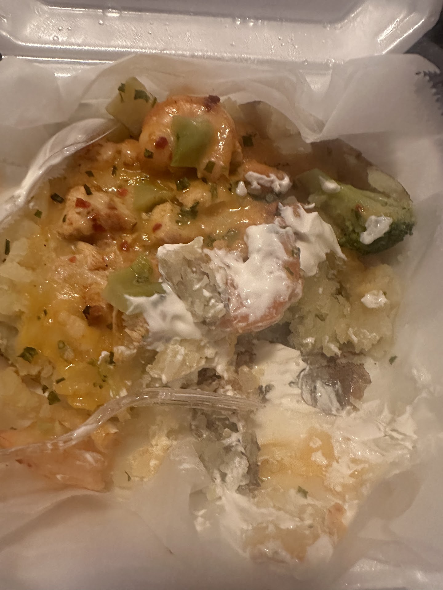 Read moreToday was my I’ll give them one last chance and boy was I disappointed. I’ll start with my last visit I went up to the register to order and asked for the New Orleans baked potato however could they minus the bacon because I don’t eat pork and add chicken I was instantly met with attitude we don’t do substitutions that’s a build your own so I respond and say that’s fine well can you key the build your own in exactly like the New Orleans with the changes so I can get that taste I was looking for from my previous experience ( there was no issue when I made the exact same changes before btw) so with an attitude we do it. Get home the taste was ok but still didn’t hit like before and with the mix of the attitude I wasn’t going to return. Fast forward to today I decided let me give them one more chance again in search of that original taste. So I wouldn’t get attitude as the same lady was answering the phone I ask for a build your own like I was directed to do last time and ask can I get what’s in the New Orleans minus bacon add chicken and broccoli she said ok 30 mins. 25 mins my phone is being called about this 30 mins order but I was on an important call about to get out of my car so I didn’t answer. I get inside my food is ready which is great. I arrive home and see why when I tell you I have barely any toppings on this thing I literally had 4 shrimp and 4 pieces of broccoli (only 1 actually stem) chicken was a fair portion. The shrimp is not cooked the correct way so flavorless they were same for the chicken as well as it was extremely dry for the chicken. When I tell you sheer disappointment in the downfall here. I could probably tolerate some of the attitude if the food was still good but to tolerate bad service with subpar food now I cannot. I definitely won’t be giving my hard earned money to this establishment again. Pictured is 2 of the 4 shrimp and the only chunky piece of broccoli given the rest were...