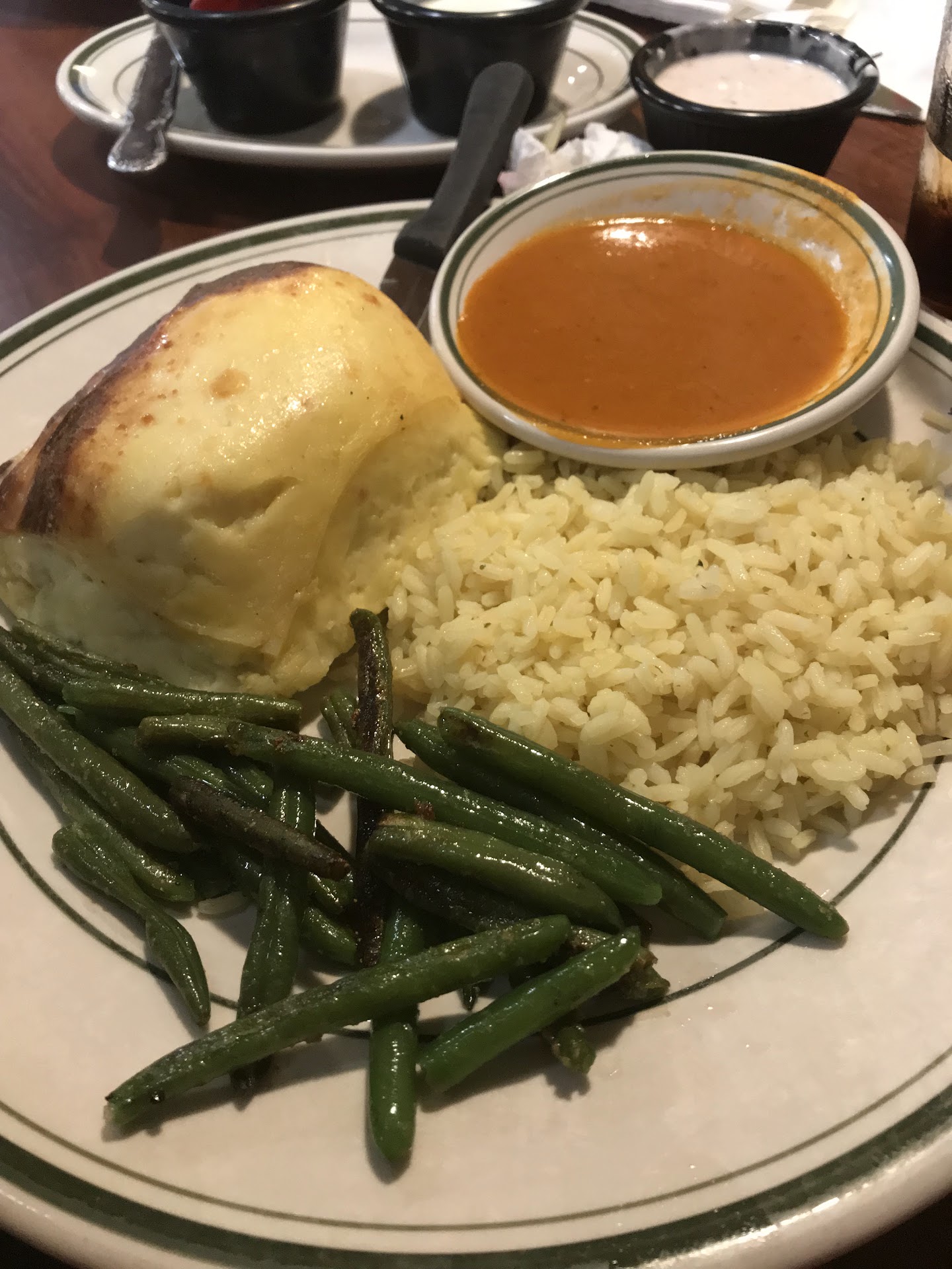Beef barley soup, a little bland but I don't expect much from beef barley soup. I added a bit too much Tabasco and made it inedible (myself, that's on me... lol) Ribeye, done medium - was cooked well, but it was on a flat top most likely so not all the of fat was rendered to my liking. Steak was overall an 8/10, I'll stick to cooking it on my grill for when I want a real treat like ribeye. Mashed potatoes were good.