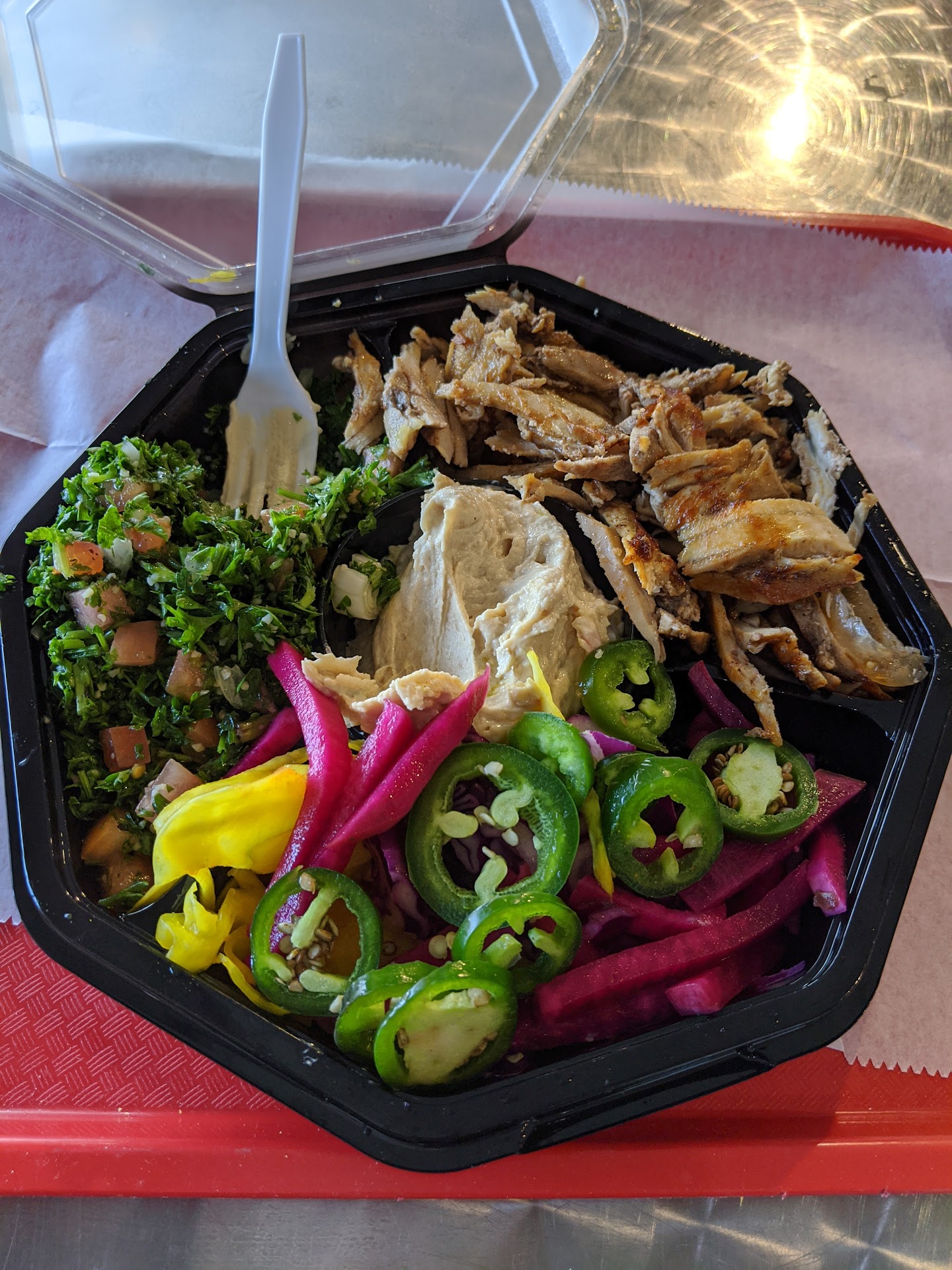 The setup is similar to a Subway, in which you pick your bread, meat, sauces and veggies. They amke everything to order right in front of you. The garlic sauce and Tahini sauce are amazing. The vegetables are crispy and fresh. The meat is tender and flavorful.