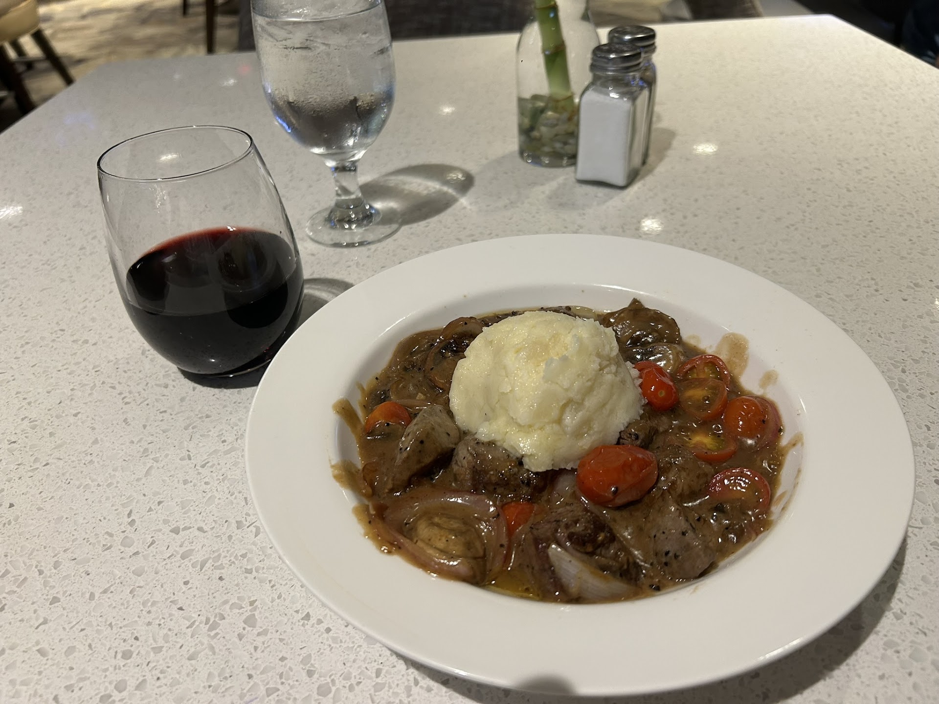 Read moreI did not have car for the first night at the Westin, so I was captive to Tangos. I believe the description said "casual but elegant", however I question the latter. It tries to double as a sports bar, and fancy restaurant, but you cannot have elegance with a party at the bar. The bartender was very popular and folks were having a good time. Because I soloed, I positioned myself away from the bar, but in view of the tv screen. My server, Chris, was efficient, and professional, as were all Westin staff. I ordered a glass of a Paring red blend at $13. It was fruity, but the finish had some bite to it. The list overall was okay. For an entree I ordered the Zip Tips, sauteed beef tips with mushrooms sauced over garlic mashed potatoes, at $34. Frankly, the Zip sauce could have used a little zag to go...