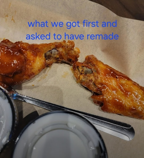 Once we started picking them up to eat them i realized... they were the same exact SAME wings we sent back. I have photo proof 💀 at that time, my husband realized that instead of 20 boneless wings they'd only eaten 6 each and had 3 left so... they got 15 instead of 20 🙄