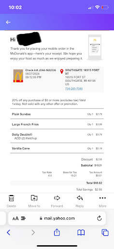 The first worker I spoke with was incredibly nice and relayed my issue to who I assume was the manager. I overheard her say “I can see the money came out of her account”. The “manager” on duty came over and I re-explained what happened. I showed her that the amount that was taken out of my account was the exact same as the amount of the “incomplete” cart in my app. I even showed the below screenshots, which include the order confirmation email I received FROM MCDONALDS.
