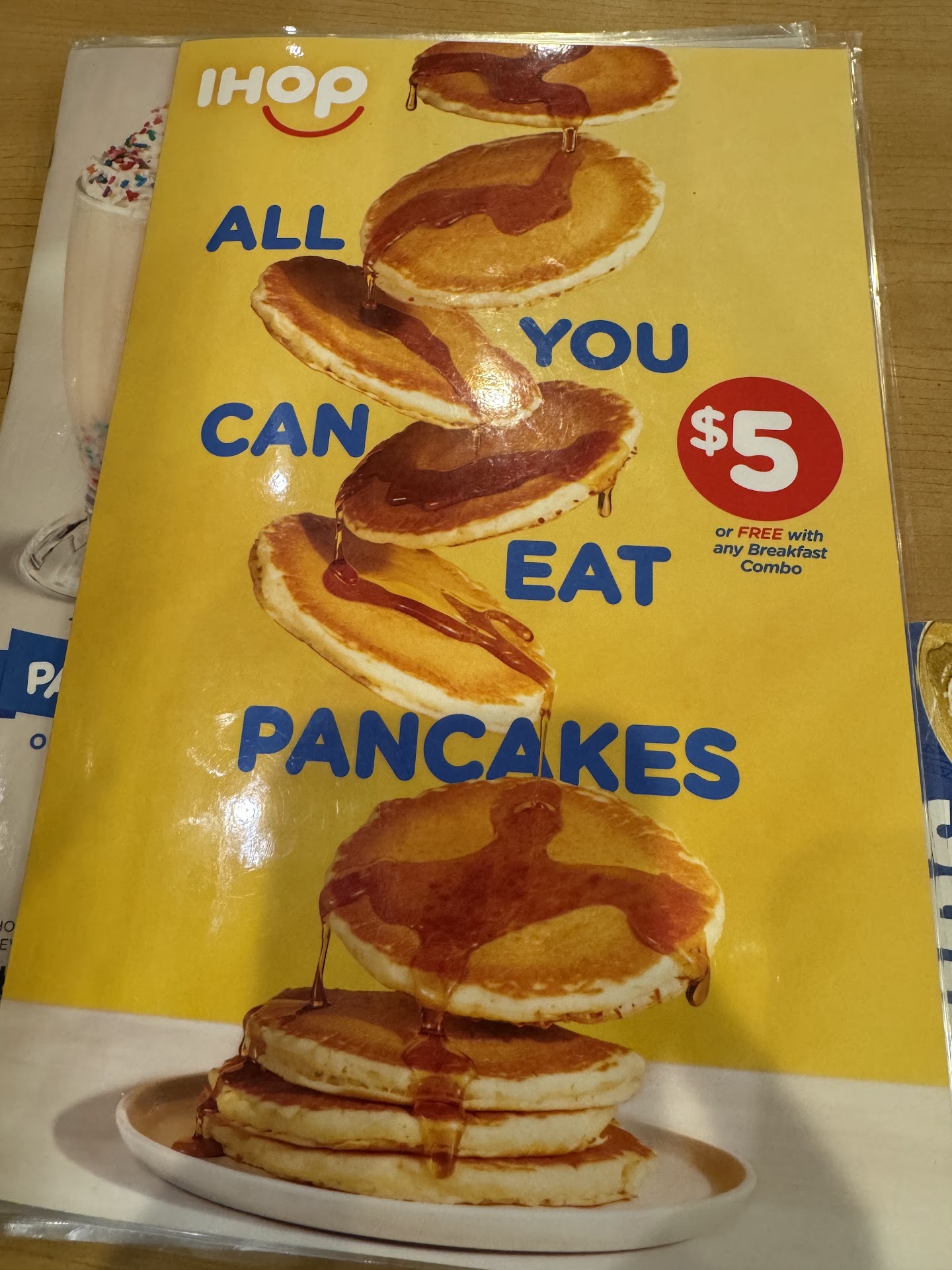 It was the worst experience so far in an IHOP and I’ve be been to ihops more than 100 times in my life. The beginning was OKAY, we (4 adults and 2 kids) got sat down and were asked for our drinks. They came back missing some of the drinks which totally understandable there. I forget to put my socks on before work sometimes is how bad my memory gets. So that’s out of the way and I get my coffee which was half filled, again, understandable because he was working a whole 3 tables and it was tough for him because between staying and talking to his coworkers and doing his job is extremely difficult. Now the part where it’s rated 1 star. We’ve all finished our drinks, and have ordered already…. An hour and a half ago. The guy, who I won’t name, but you’ll be able to tell who it is by the very strong smelling aroma of marijuana, was disappeared for a while and I started asking other servers for what my table needs. “Finally, the foods comes!” I say. As they hand out strawberryless banana strawberry pancakes, an order of full stack never ending pancakes that wasn’t ordered, a really dry burger, and the rest of our food. As they left, our waiter, returns and I tell him that I do not want the unordered pancakes, more strawberries for the one order I mentioned, and to take my burger away as I didn’t want it. He was completely dumbfounded at the remark like he has just heard the worst news of his life… or maybe it was that he was really high? Who knows. But he gets the manager and takes the order out of the way. We had a new server take over and she made us feel welcomed for the last 5 minutes we were there, also cracked a few jokes. Her name is Anais, something like that, if you wanna visit, request “baby manager” is what she refers herself as, kind of a step below the manager haha. If you come, careful who you have as the server here, you’ll regret not bringing a sleeping bag or eating at home...