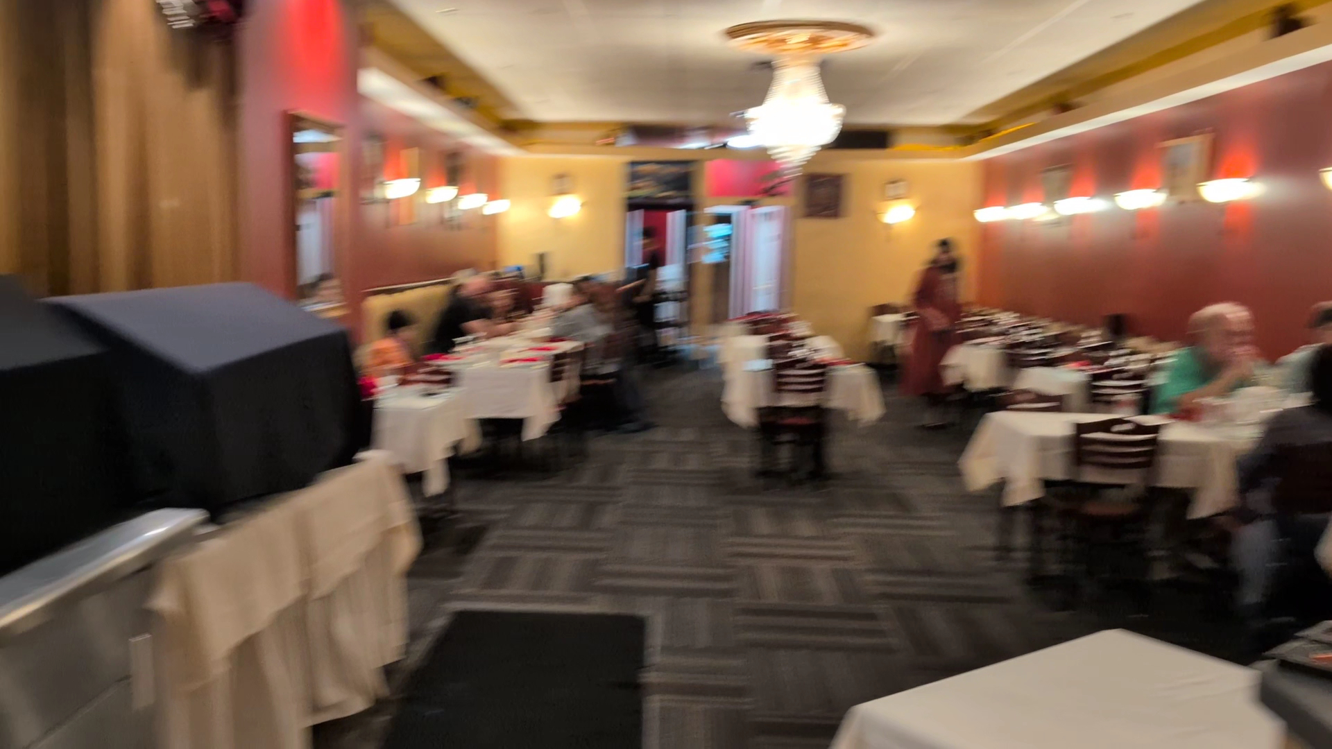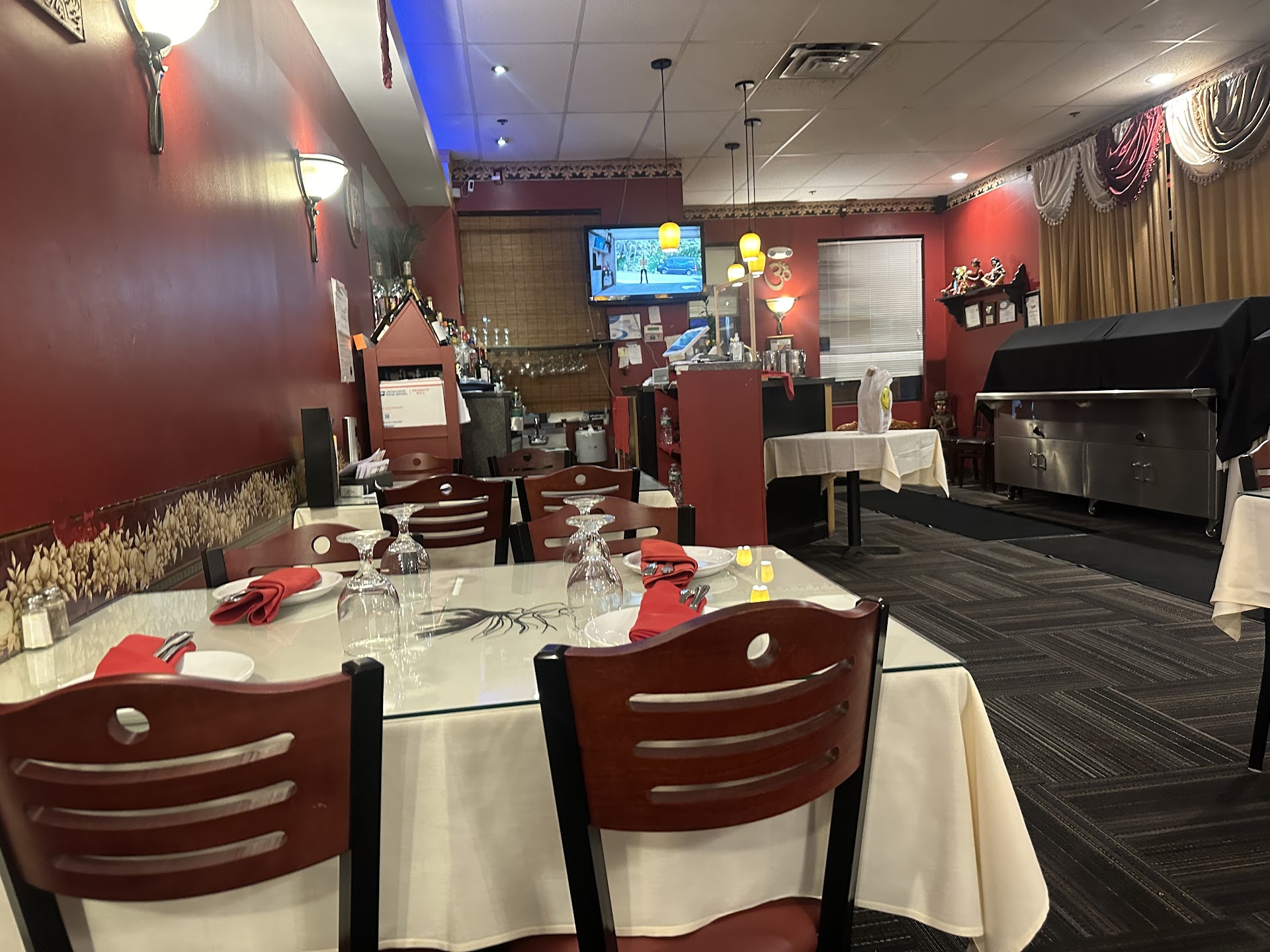 The dining room continues the theme—white tablecloths under crimson walls, gold-trimmed drapery creating theatrical backdrops. It's a space that takes itself seriously without feeling stuffy. The divide between dining area and pickup counter creates an unexpectedly entertaining dynamic. As you savor your meal, a parade of delivery drivers and takeout customers provides a constant flow of humanity—suburban theater at its finest.