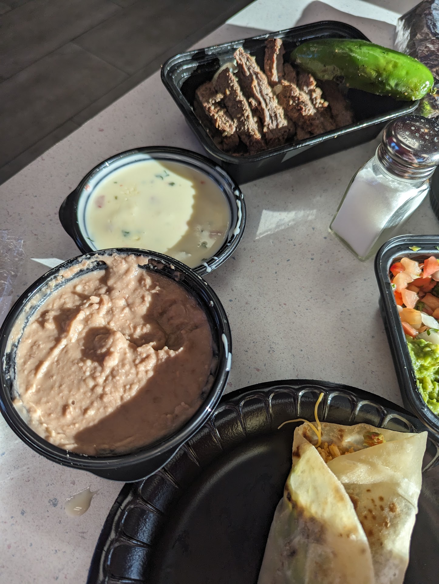 They are takeout and delivery only which became apparent as soon as we stepped inside. Whoops! However, the gentleman behind the counter quickly convinced us to stay by offering us some samples of the beef fajita meat and the margaritas. The beef was so tender, juicy, and well seasoned... it took me by surprise how good it was! The margaritas (peach, strawberry, lime) were each good and distinctive from each other. The gentleman offered to pull out two chairs to a small table in the corner or bring the food to our vehicle if we choose to wait there. We chose the latter as we had our newborn with us.