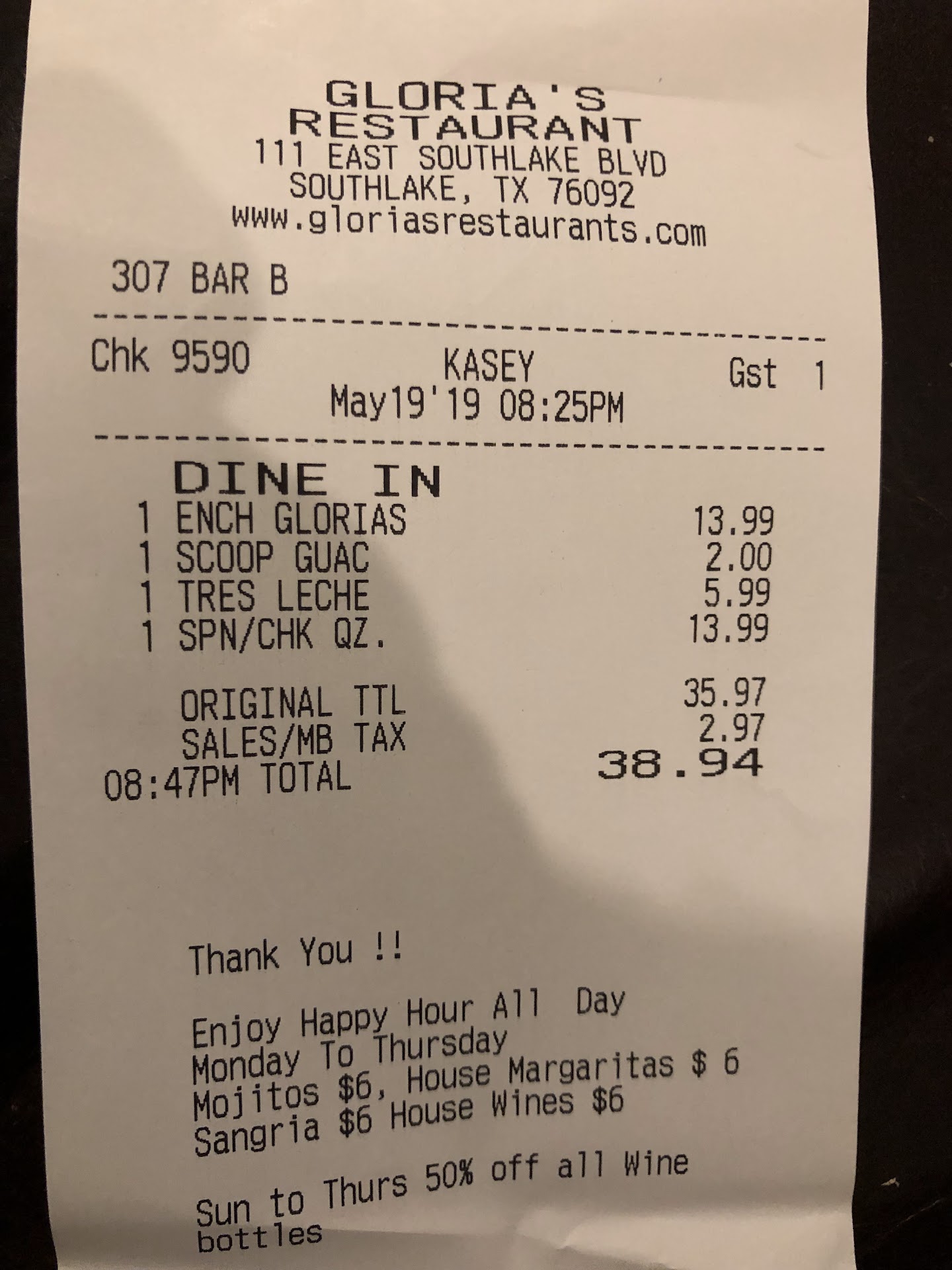 Read moreEverything is overpriced. I know its Latin cuisine but it may as well just be overpriced Mexican food. The Lg guac is $8+tax for what was 4 small scoops of older looking mashed avocado with diced tomatoes on top and shredded lettuce throughout. LETTUCE on guac. Ridiculous. The combo fajitas ($17+tax) meat was skimped, overloaded with onions and peppers. The a la gloria enchiladas were subpar as the shredded chicken was very bland ($15+tax). Last but not least important to note, the spinach and chicken quesadilla was mostly spinach, limited cheese and limited chicken; and also very greasy ($14+tax). On top of that, the service was subpar. Barely had any dishes bussed all nite, and I even helped organize dishes to be bussed at the end of the table, and my server, almost as an attempt to make a point, starts bussing our dishes as we are handed the bill. Overall disappointed for a Saturday night at 9pm where you'd expect the staff to be on point. Won't be coming back. I believe restaurants in our area are continuing to lower their standards because they know clueless and gutless pedestrians will continue to come back, regardless of how poor the quality of the food and service is; and refrain from making a fuss in front of their loved one or family. Frankly, it's embarrassing. Go get Frezko Taco Shop down the street, and you'll find better Mexican/Latin/w/e tf u wanna call the food, togo or dine in there. Oh, also, no beers on draft, what a joke. Can't believe there's a valet for this place. It's a 2.5 star restaurant at best. A year ago, it was about a 3.5. Funny how restaurants get worse and worse over time. Something to...