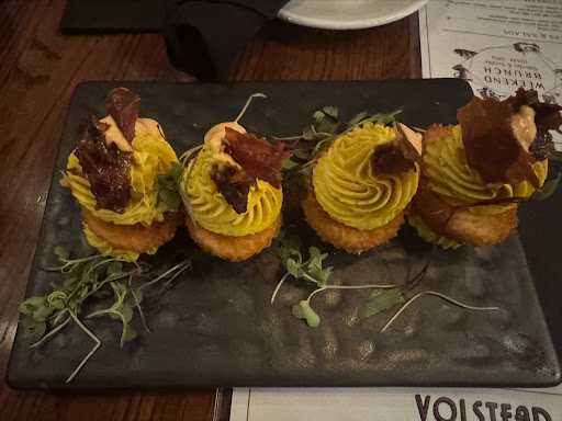 Crispy Deviled Eggs plating was far better. Two whole eggs deep fried and filled with whipped yolk and a crispy out layer was good but missing something flavor wise.