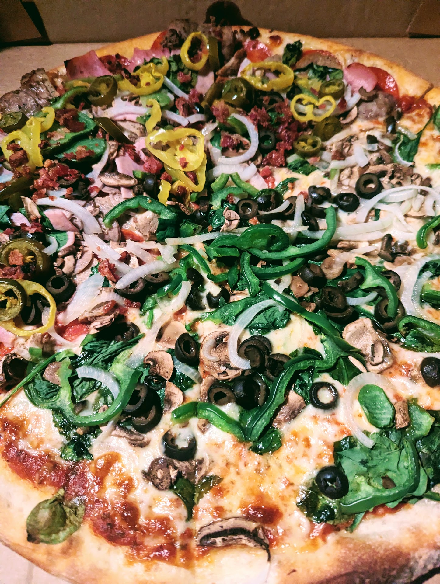 So one thing about the negative reviews. This is a brick oven pizza, not something that comes off a conveyor belt. So if you want an assembly line pizza or are picky about the crust and toppings being exactly the same every time, then go somewhere else. And this pizza is much better if you eat it on-site rather than taking it home in a cardboard box for it to sweat. That's where you'll get the soggy crust. It's awesome fresh out of the oven.