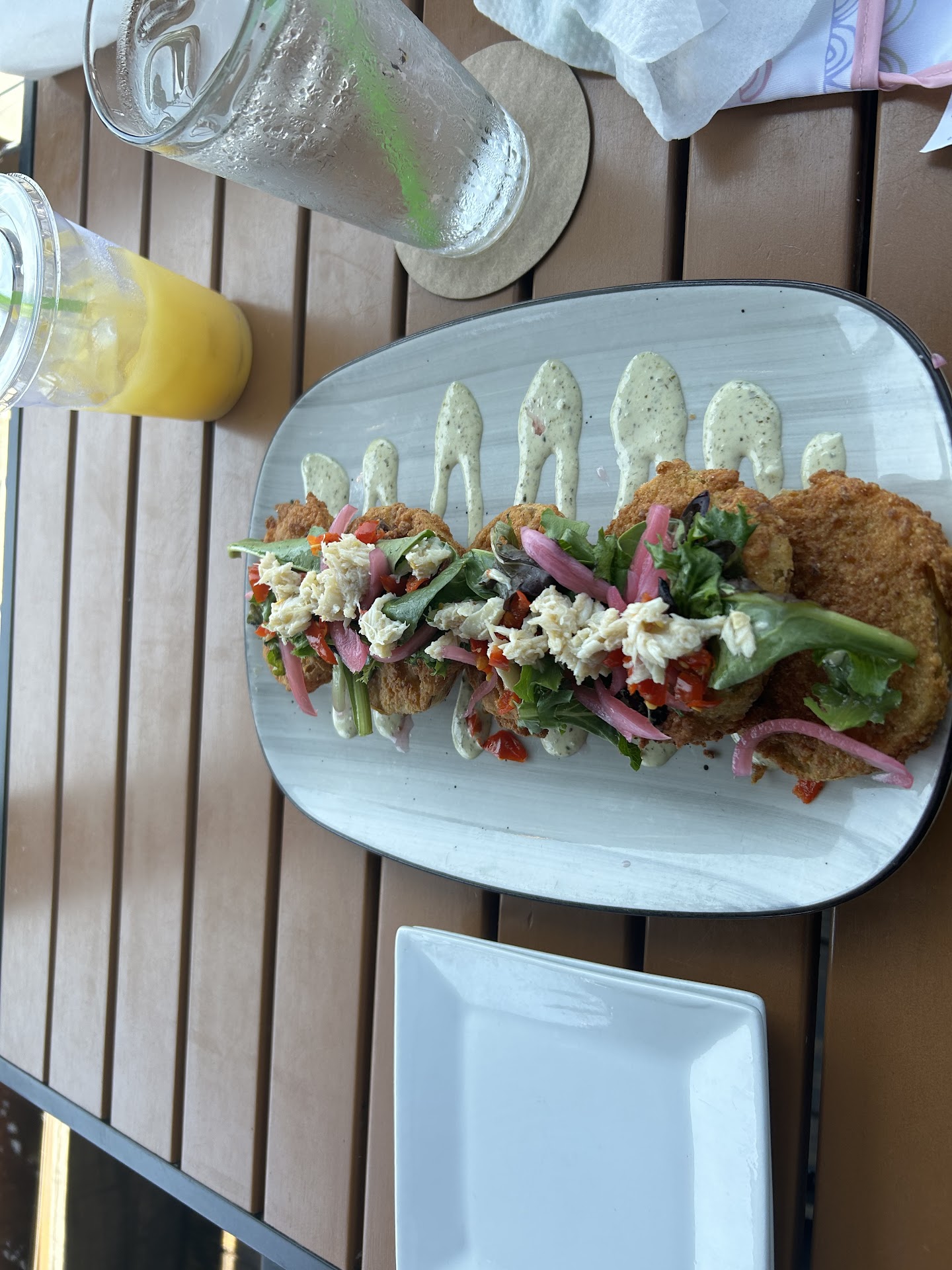 Take aways. This place is very well decorated and gives off a good vibe. It has a very nice outdoor, waterfront atmosphere which got my rating (up) to 3 stars. The limited lunch menu, the poor quality of something as simple as a salad, and the timing of our service almost makes 3 stars seem generous.