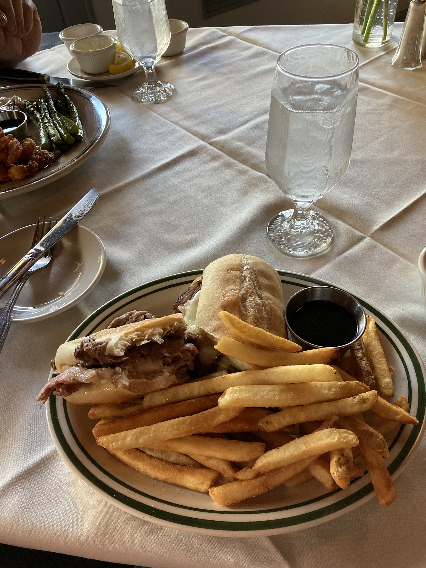 Read moreWe’ve heard raves about the prime rib here, so fussy British hubby got that and fried shrimp. I got a French dip made with the prime rib. The Angus beef lived up to its name in terms of tenderness and fat content…BUT both of us felt as if we were chewing on a tall glass of water, for all the flavor it contained. Only afterwards did we realize there was a reason the waitress offered to have the beef blackened. At least then it would have had some type of flavor. *Here I will note Covid taste loss can play a part in this experience. It’s a different world now and some chefs have upped their game in response. Have the wait staff inform guests of subtle flavors and suggest blackened meat for more robust flavor. * As for the rest, my Londoner thought the shrimp was just passable, but gave high marks for the salad ingredients being fresh. He thought my fries were the better sort of frozen restaurant-quality product. Taking one star off for service because the waitress could have dropped off our check before taking orders from her large group, or give it to someone else to deliver. We waited an uncomfortable amount of time at our cleared table. Another organizational note, you need a reservation for this restaurant. We’ve been turned away at 4:30 in the past, so this time we had our reservation but the couple in front of us didn’t. They were turned away at first but a waitress suggested a tiny table for 2 right next to the door. I only mention this because the place was barely 1/3 full the entire hour we were there. It just seems like an odd choice...