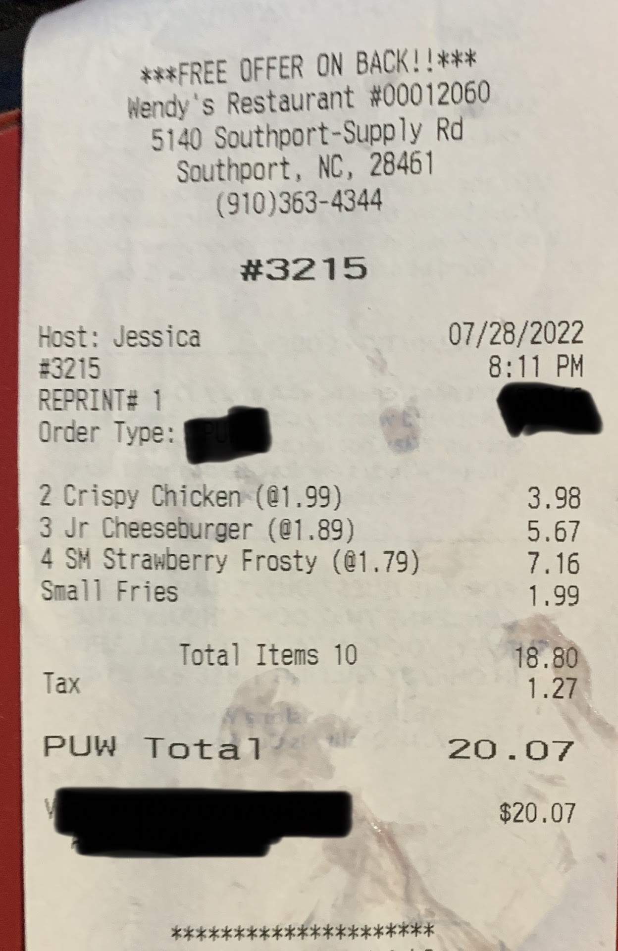 Read moreI liked Wendy's in Southport until recently. I went there yesterday afternoon around 4 and sat in drive thru for about 15 minutes till I got to the speaker (there were 3 cars ahead of me). When I got there they said I'll be with you in a minute. The 3 cars ahead of me were serviced and I still didn't get help. I finally said hello into the speaker and they said hold and there was nobody in front of me (see pic). Finally she said what do you want? I ordered a medium fry and two large chocolate frosties. She said drive up to the 2nd window. A lady gave me the frosties and said we are waiting on your fries??? How when I was sitting at the speaker at least 5 minutes with nobody in front of me. This is the 2nd time in about 3 weeks that I went there and there was a bald guy kinda young and a lady with tattoos at the window. The previous time I went the guy was dancing in the drive thru area and hugging on the girl without a care in the world about how unprofessional he was looking. When I used to work nights and I would go thru Wendy's drive thru around 1030ish it was fast, hot, and good...