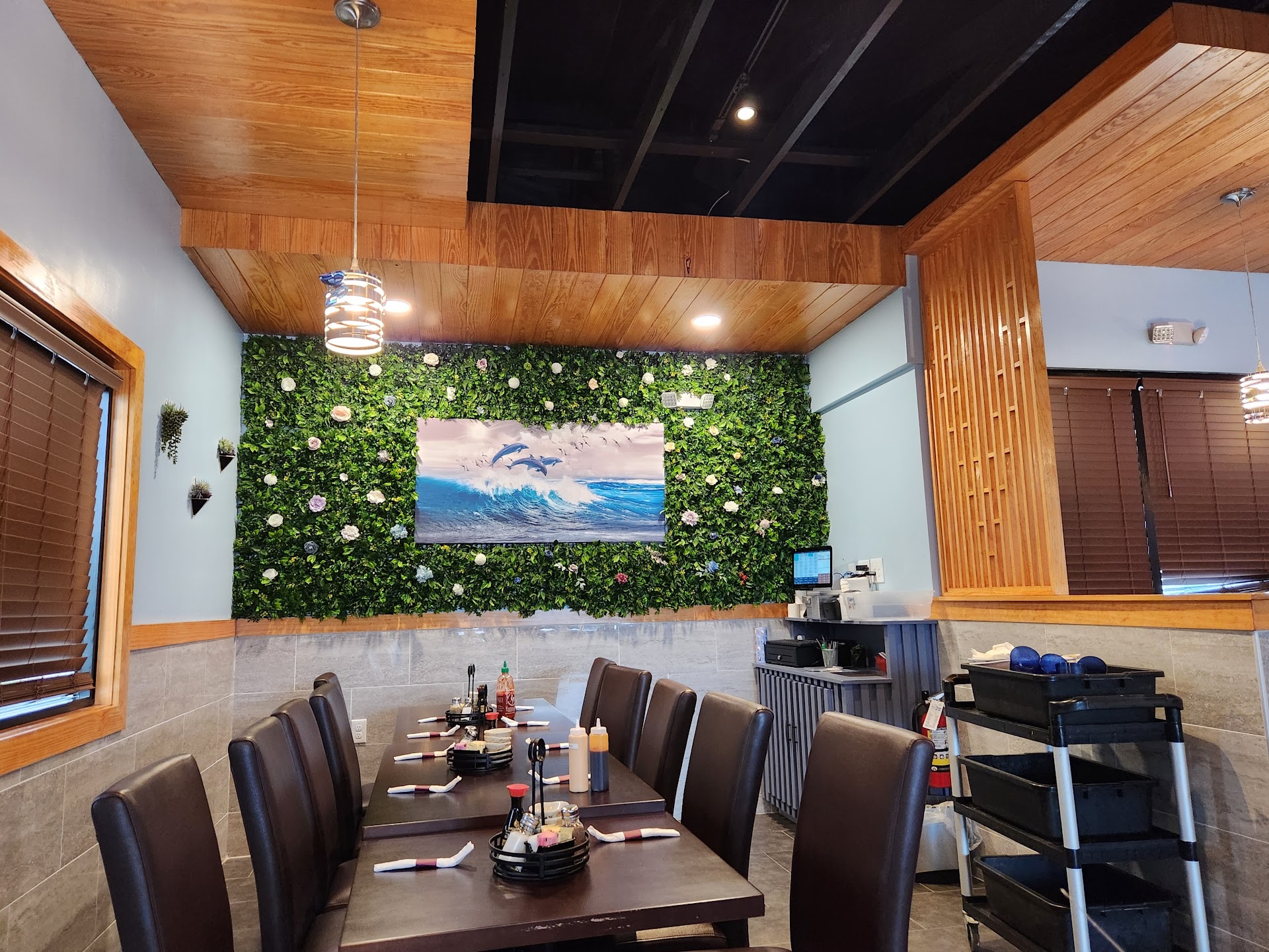 The restaurant is very clean and nicely decorated with fake cherry trees.
