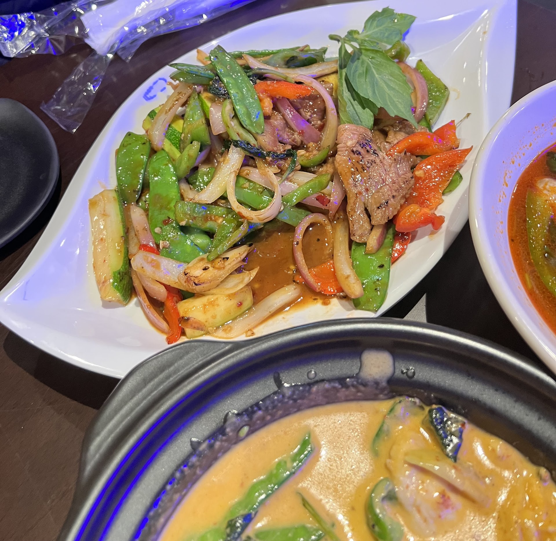 For my entrée, I had the Thai basil with beef; Tony had the garlic sauce with pork. Both were very good and flavorful. We both had white rice to go with our entrees.