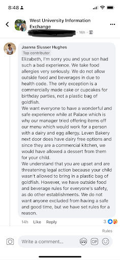 The flow of the party was fine, except for the awkward couple minutes we were waiting around or couldn't find our host to do the next activity before we ran out of time. At one point, all the kids had gotten their cotton candy were already playing in the bay, and the bay froze and stopped working. I couldn't find our party host to fix it. My friend finally found her and asked her to help, and she told her she was coming, but 5-10 minutes went by and we looked over to see her and two other servers recording on their phone of them making cotton candy for a video while all our guests were at the bay waiting (not sure if they were recording for marketing or for TikTok). We just ended up asking the lady who was in charge of renting the bowling shoes to help, which she did immediately and was very nice. None of this was that big of a deal until the party host said I wouldn't be able to do the dark ride after 3pm even though I was told that would just get added onto the end of the party so it wouldn't cut into the time we had for bowling or the bay. This was frustrating because I had communicated what time I wanted to do each activity beforehand and to the host when we got there, and then after having to wait around, we felt rushed to get through the cake so we could make it to the dark ride.