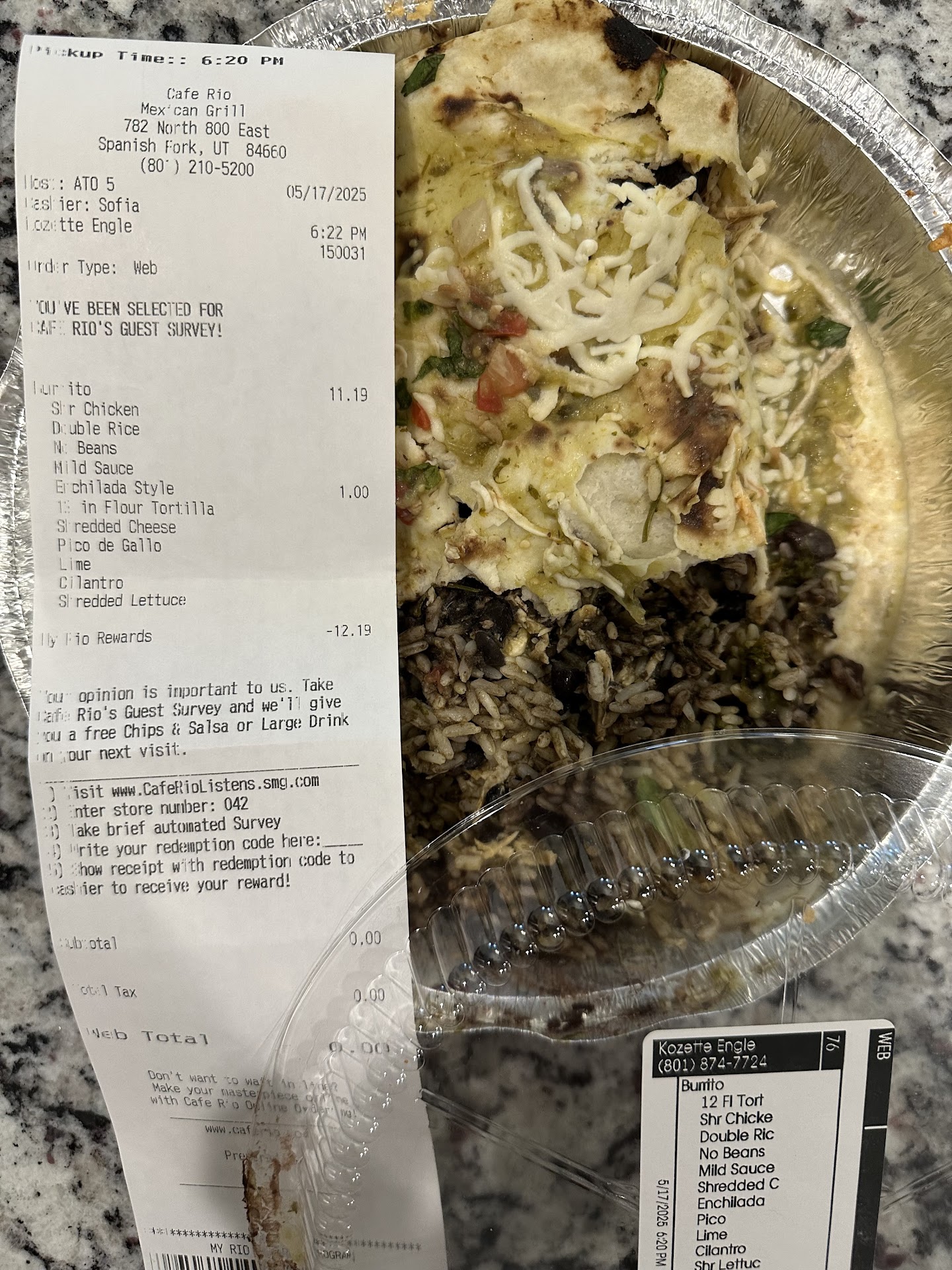 Read moreI go out of my way for Fideo Friday and other days. Most of the experiences I have had at Café Rio have been great. However, I went to the Spanish fork and the service in their "To Go" department was more frustrating than anything I have ever experienced from Café Rio. The employee Wyatt indicated that there would be a 55 minute wait for my order of one Pork Burrito for myself and a kids quesadilla for my son. After about a half hour or more, I arrived a little early and apologized for being early but asked if there was a chance my meal might be in the works or if it was possible to receive my meal even a little earlier than the 55 minutes promised. Wyatt informed me that the wait would not be one second more or one second less than the 55 minute time frame that he promised. This comment seemed a little strange as there was (based on my experience with Café Rio) less than average traffic. This comment was also what caused me to immediately cancel my order and go somewhere else for dinner. There were no other customers ahead of me or behind me in the "to go" line. I understand they may have some sort of intention of keeping the "to go" meals more fresh and more warm if they can promise them at a certain time. Or even some other motive but unfortunately, Wyatt offered no explanation. His message was abrupt and carried a demeaning tone not characteristic of a customer service representative at a dignified place of business. The frustration was not entirely what he said but certainly how he said it. I really enjoy Café Rio normally and have not had this poor of an experience at other locations. I will continue to enjoy Fideo Friday's and eating there with family and friends, just not at...