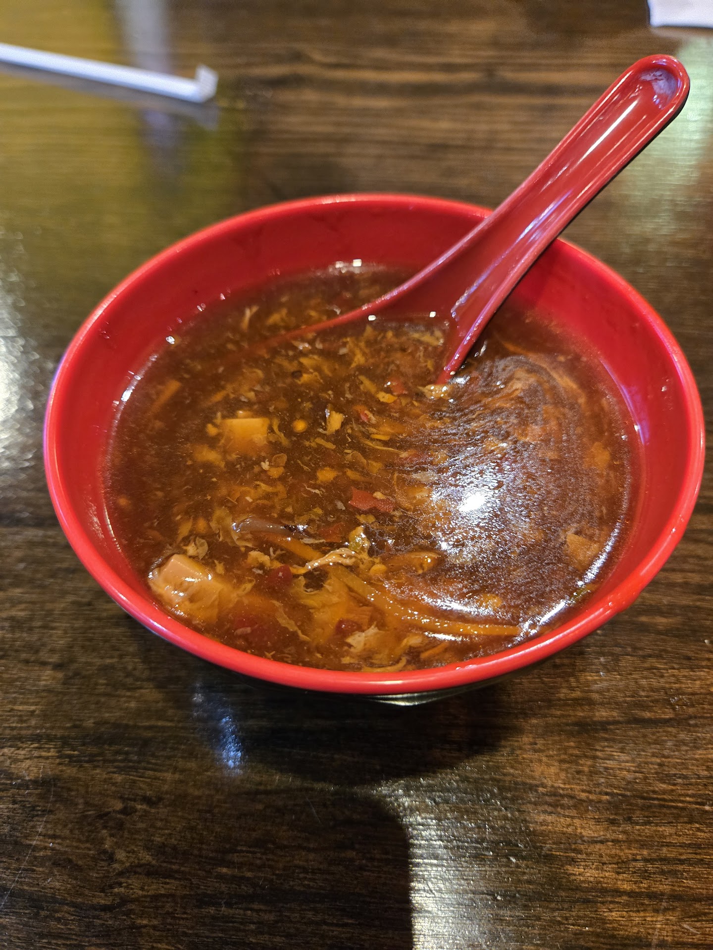 Today I ordered the Red Thai Curry. It was excellent. Creamy and sweet, the sauce was amazing. On the side I had a choice of steamed rice or fried rice. The fried rice was great. Also, I had a choice of soup. They have Miso soup (Japanese), Egg Drop (Chinese?), and Hot and Sour (Chinese). I tried the Hot and Sour soup. I have tried it at many restaurants, and this was the best I have ever eaten. I am looking forward to having it again. They also tossed in two Gyoza, which were delicious.