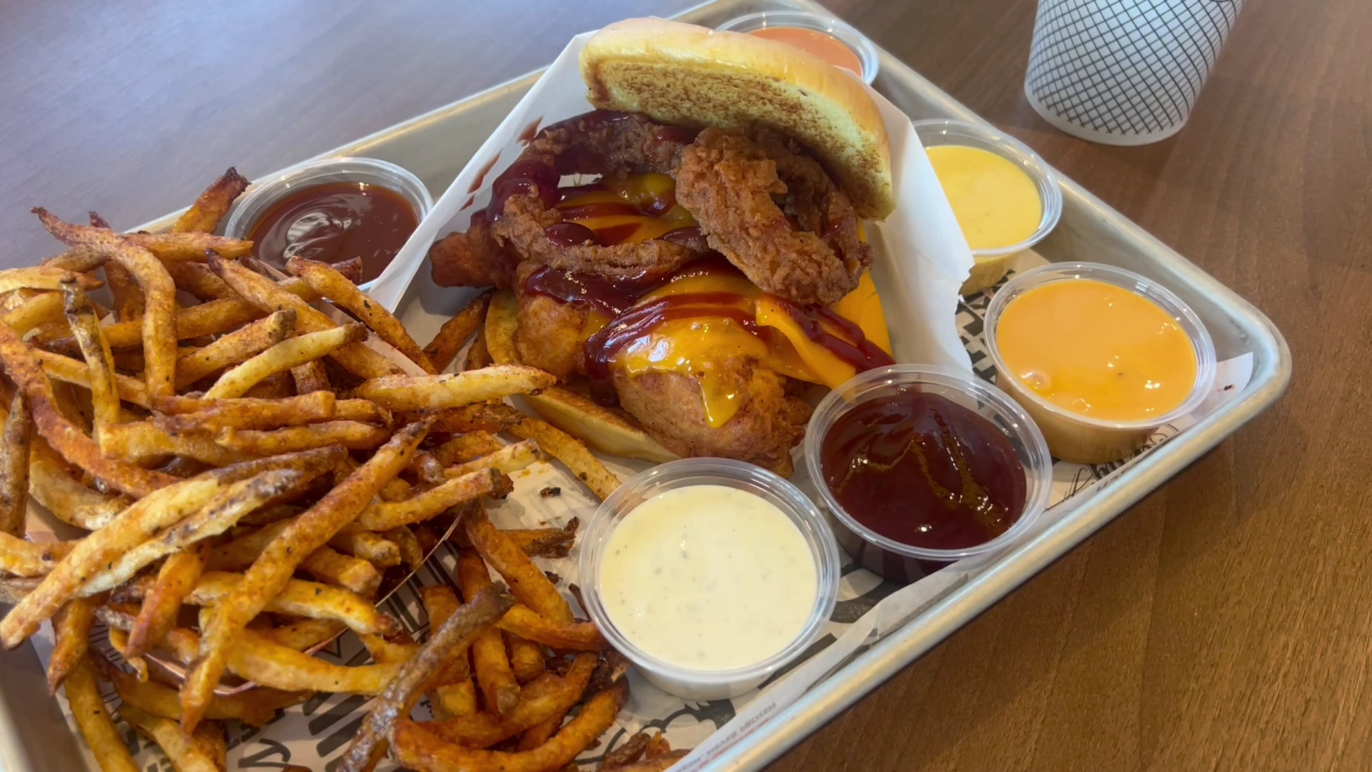 Our turn to order came before we had decided what we wanted. Feeling we should stick to the basics for a genuine taste of what the restaurant had to offer we opted to try the grilled chicken sandwich and the Buffalo chicken sandwich, with salted fries and a chocolate custard to share.
