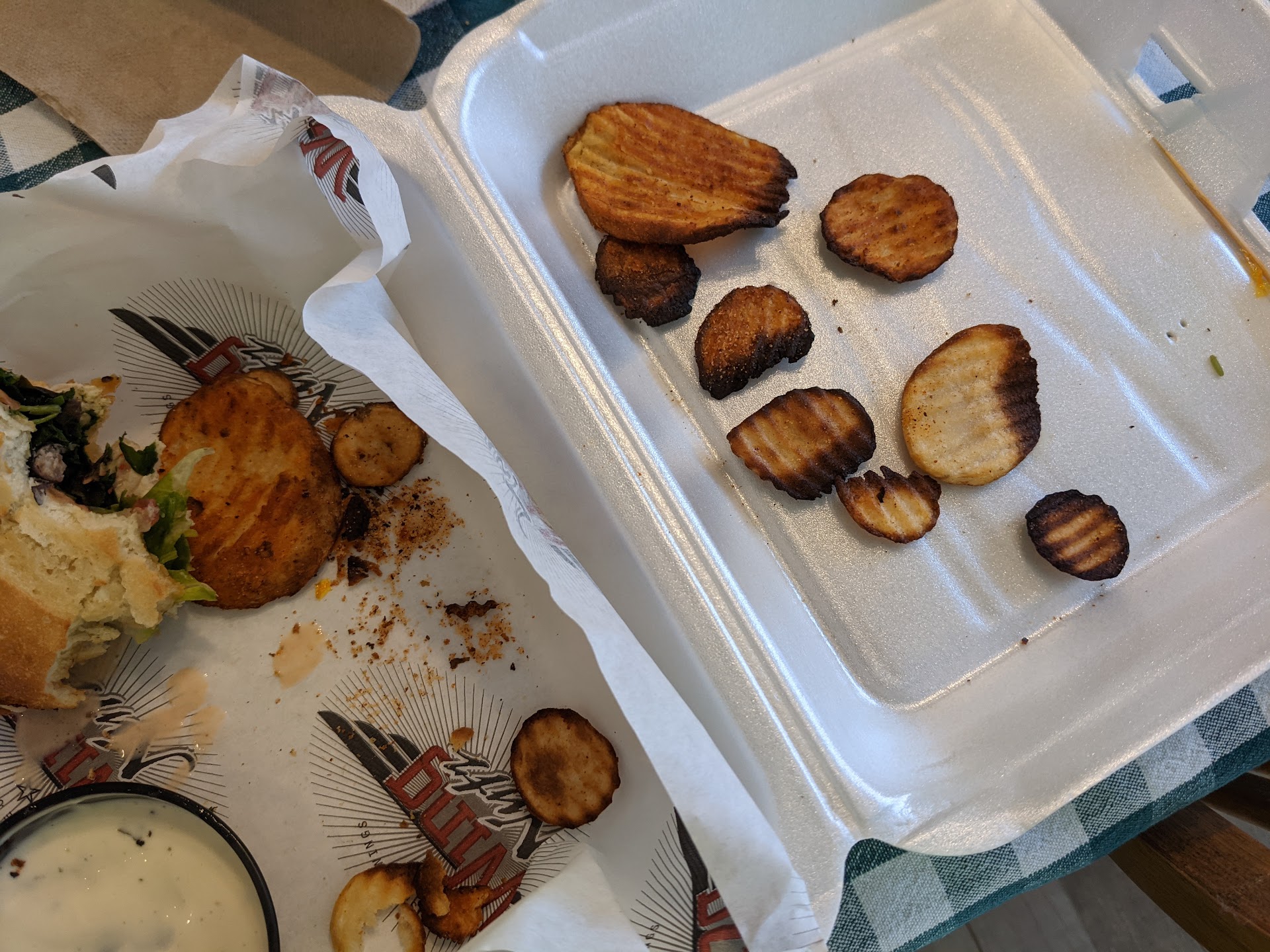 Food critique: The traditional bone-in wings were pretty good, which is why this is not a one-star rating. The boneless wings were a bit dry. The jerk sauce I was able to salvage was good, as was the traditional buffalo. The southern honey bbq and chipotle bbq were fair. The apricot teriyaki - nope. Bleu cheese was good. Carrots and celery - warm and floppy instead of cold and crisp, packed in with the wings, and not nearly enough...