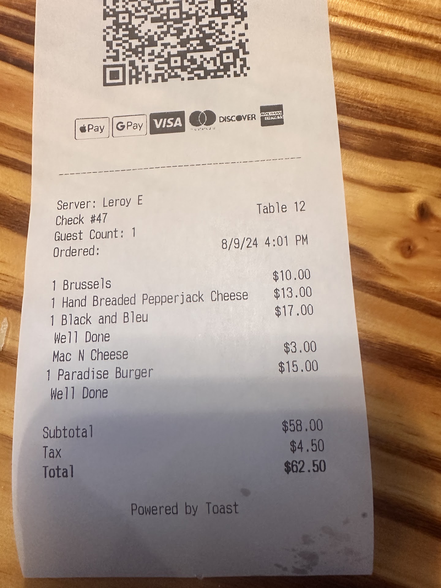 Sadly to say the pictures as shown was my paradise burger! The receipt said burgers well done! We were never addressed in the beginning how we would like our burger cooked for one, secondly if this is the quality food they send out, is beyond unacceptable! A burnt bun??