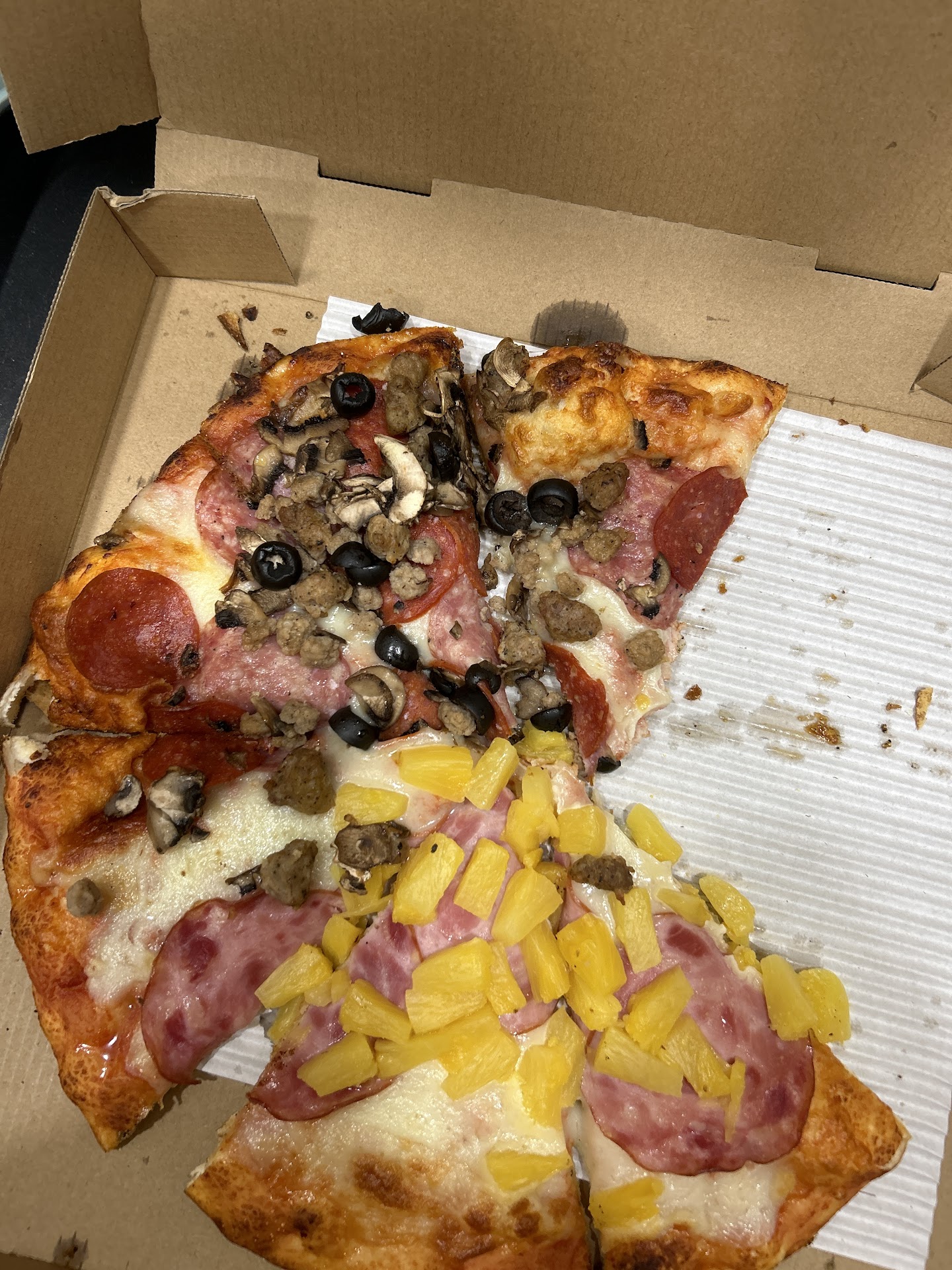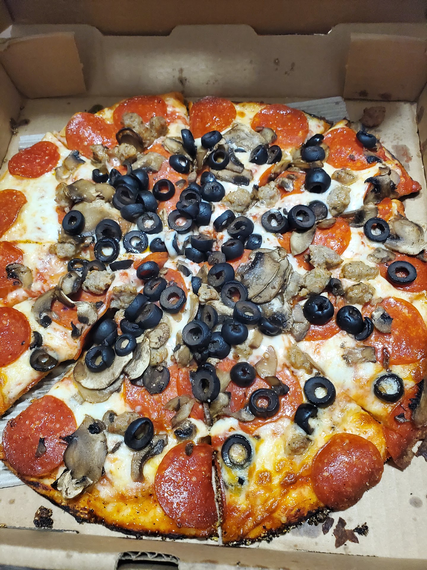 The pizza was bomb. 100% exceeded expectations and I wish it was local to my area so that I could go more often. We went with standard pepperoni on half, veggie combo on the other side. Normally, I found that stacking veggies tends to make the crust underneath pretty soggy and I was especially worried that would be the case with a half/half pizza. They completely avoided that issue and the slices were perfectly rigid without being to tough to chew.