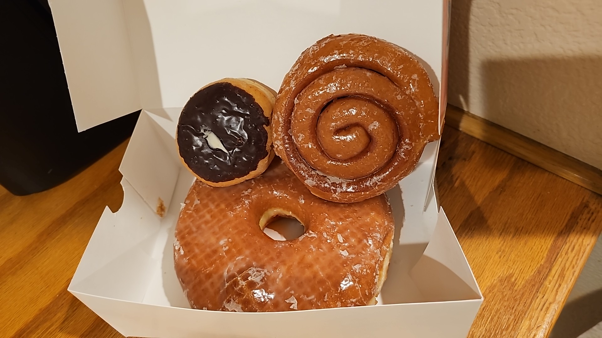 I personally believe wholeheartedly that the donut bistro is the best place in the only place to get donuts in northern Nevada. I don't know what they put into them, but they are hands down the only place to get donuts. I started getting my son. Their big giant donut every year for his birthday and all his friends would get so excited because I bought it from Donut Bistro. My oldest lori went to school with the owner's oldest son. I remember all my daughter could talk about before they opened was how they were opening up that donut shop. My family is so very grateful that they did because we get donuts all the time here. If you never tried out their fantastic donut, I highly recommend you bring your family here, and you, too, will be hooked. I am adding a picture of my big donut, my cheesecake filled one, and just 1 of my huge cinnamon roll because the other one I sat an ate in my truck. But just so you see, it's worth every penny I paid, which was under $10 for all of them.