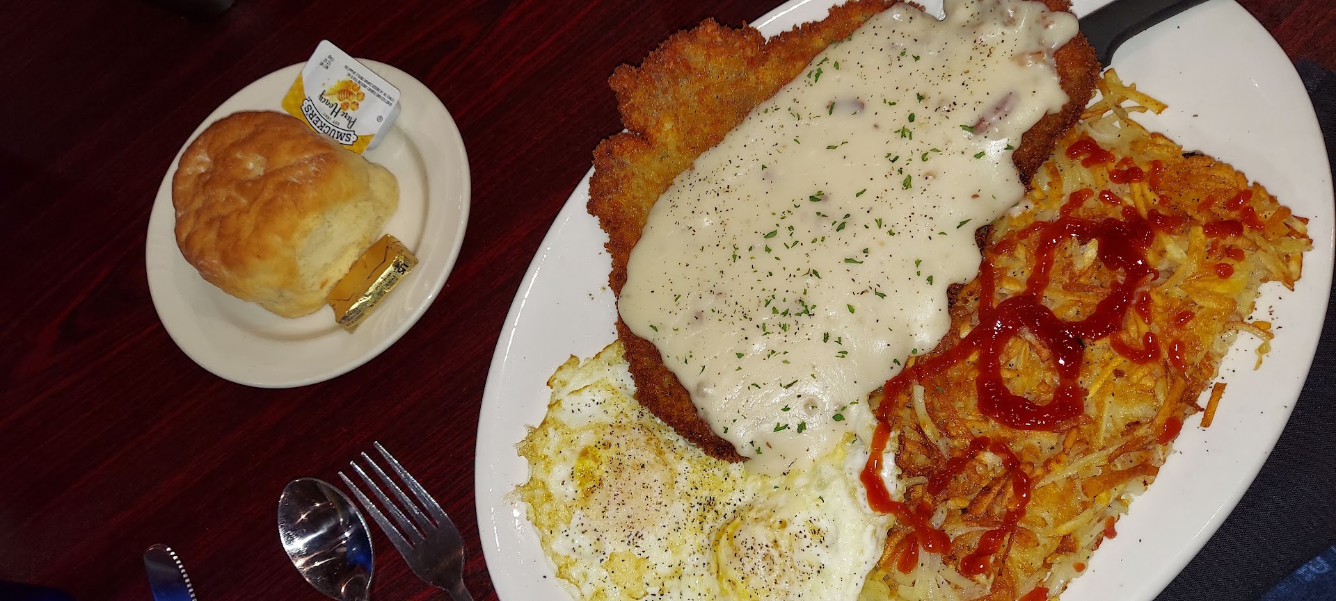 So! I ordered the Chicken Fried Steak with Country gravy & eggs, crispy, golden hashbrowns, and a pillowy-soft, fluffy, warm country biscuit with honey and butter. The steak came right to our table out of the fryer, so it was still sizzling and bubbling!