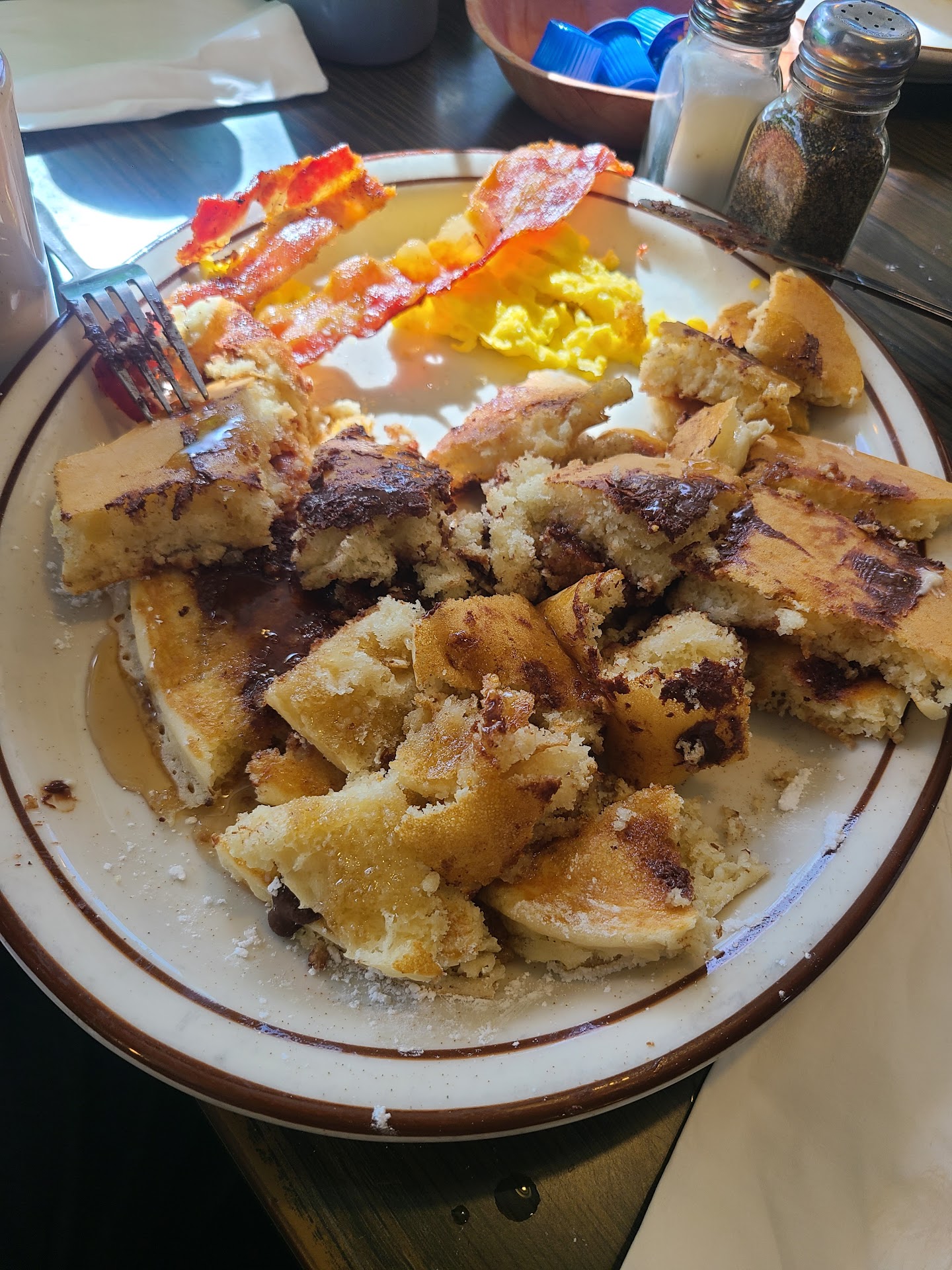 Upon entering, the atmosphere was warm and welcoming, which initially set a positive tone. My wife ordered chocolate chip pancakes, expecting a hearty serving, but what arrived was a disappointing plate with just a sprinkle of chocolate chips on top of whipped cream for $4. That felt like a letdown right from the start.