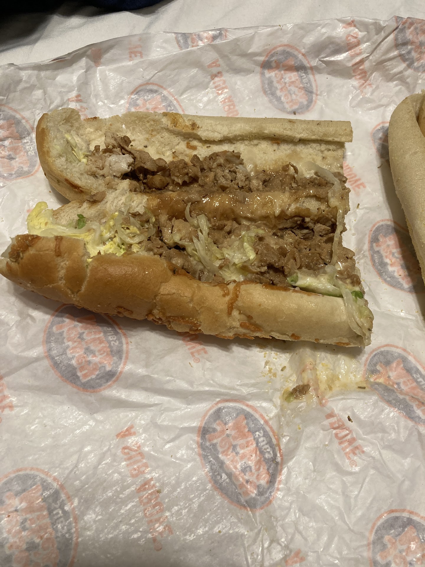 Read moreLove Jersey Mike's but this last experience was awful. I ordered the #9...everything was going smoothly until they called someone to help make the sandwich. The guy looked confused as to what he was supposed to do (which happens) when we told him what number we ordered he asked how I wanted mine. I told him I wanted it the way it details (Mike's Way). He then asks, "Yeah...but what do you want on it??"... I told him everything it says [in the description]. I don't know what happened, but he put everything on it alright; with a BUNCH of jalapeños and my sandwich was swimming in vinegar ( you should have seen the look on the faces on the people behind us as he was pouring it on the sandwich). He put everything BUT what was supposed to be in it-- the bacon (at this point I didn't care). I was gunna try and eat it. My husband's sandwich was made the same way...we started to eat it; his bread was dry/crumbling a lot-- which has never been our experience and ended up having to take the excessive jalapeños out, and the center of the sandwiches were saturated in vinegar and oil-- it was a mess, the vinegar was all...