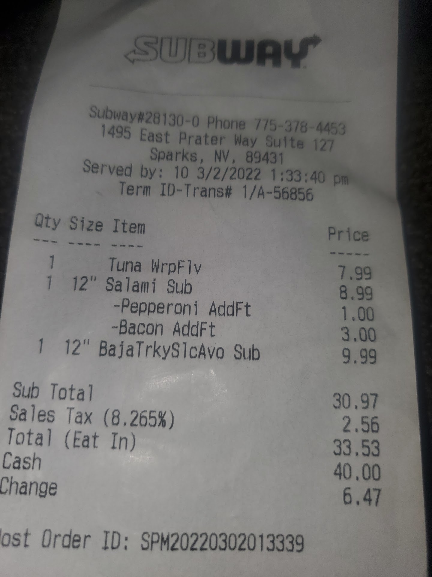 Read moreI placed an order online. Upon arriving to the store, the employee informed me that there were not any chocolate chip cookies left, which is what I had ordered as sides for two meals. I was no offered any alternative for sides and was DENIED A REFUND. I filled out a survey detailing my experience and the store owner sent me a generic emailing saying she is always looking for feedback to make the store better. She also accused me of wanting four bags of chips to replace the cookies, but I never asked for that. I asked for a refund, or the opportunity to pay the difference for two bags of chips. The rude employee said no. I emailed the store owner back asking for a refund and clarifying what had happened and she has yet to respond a week later. This is not my first bad experience at this Subway either, but I wanted to give them the benefit of the doubt because I like the food. However, I highly encourage everyone to go to Port of Subs instead of this horrible Subway. This Subway will steal your money and not feel bad about it at all. The store owner clearly does not care at all, or she would attempt to make this right and address all of the other issues laid out in the other 1 star reviews. Just save yourself time, grief, and money and go to Port of Subs. This...
