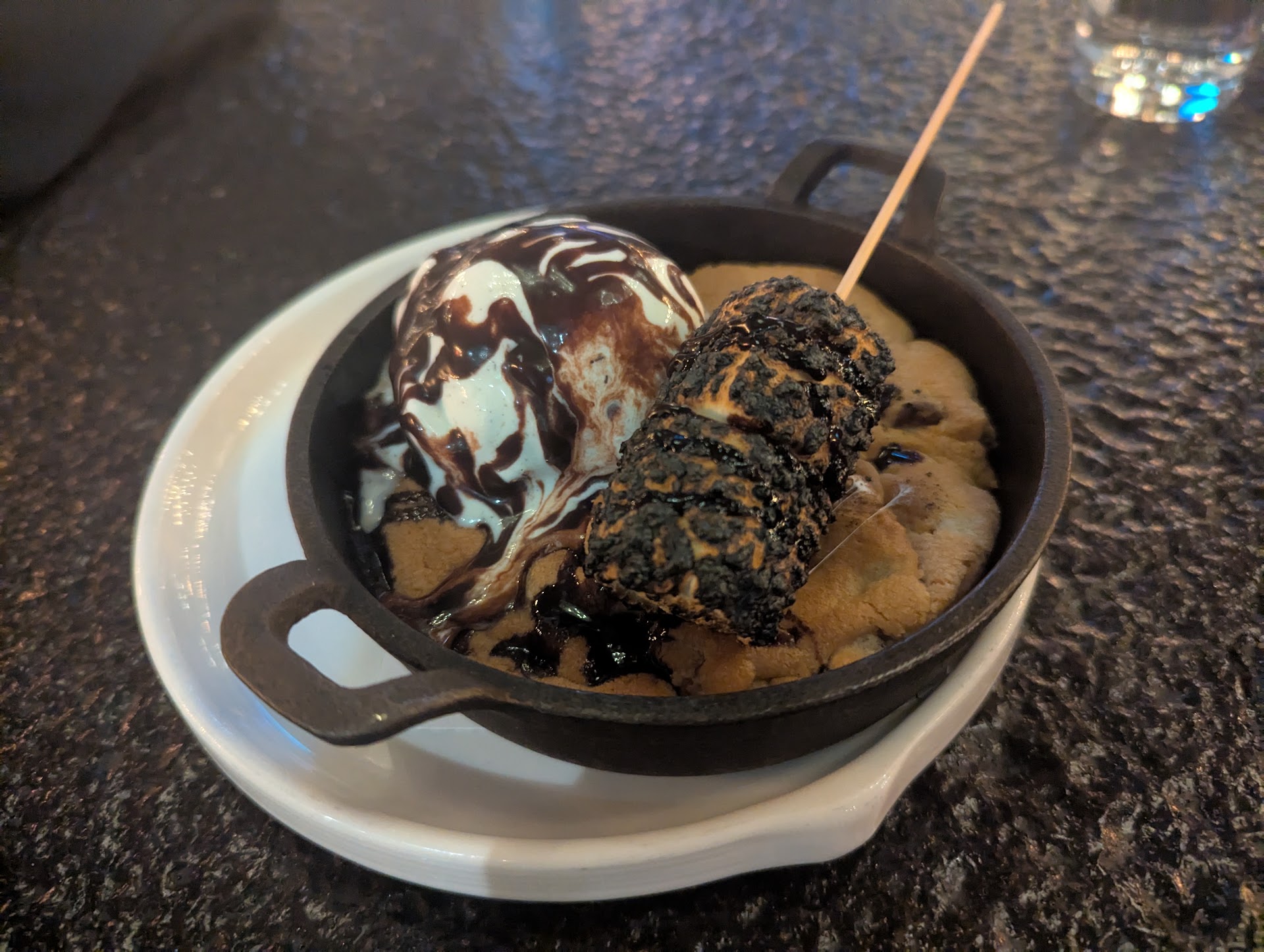 The food options didn't present a physical danger but were pretty mediocre. We got the charcuterie/cheese board, which was fine. It was very pro forma as you can see from the attached, and at least a good portion, but honestly not something I'd get again. There weren't enough diverse flavors so every sample/bite was kind of the same theme, if that makes sense. The cookie skillet was also average to slightly below average - the cookie was overcooked and required some effort to chip away at, and it wasn't particularly warm so the ice cream wasn't melting aggressively and helping moisten the hard cookie surface.