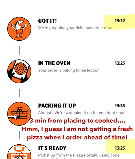 Ā Ā Ā Read moreOrdered my pizza thru app specifically to have a hot fresh lunch. Less than a mile from location and my food was just oven warm. Cheese was not gooey and grease was already absorbed into the box. When I got back to the office, I checked my app, it said: ordered at 1:22, ready for pick up by 1:26 FASTEST COOKING TIME EVER: 3 min On the box it said taken at 1:36
