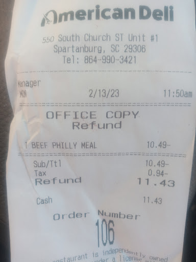 Bad bad bad. I went to American deli today and got a chicken salad and this is what I received, to get halfway down the road to my location and open my box I was so upset. It was so hard like I wouldnât even feed it to a dog and I love animals. Donât take that the wrong way however, I shouldâve knew it was a red flag when I walked in and all of the workers was laying out lounging eating all doing all types of stuff that didnât look professional But I was hungry and ready to get something to eat before work so I took the plate back she asked me what did I want to do? I said I would like more food. She asked me what food I would like. I said let me try something else being that that didnât work then she began to price range the difference of what I want next red flag that should have not been the first answer after that after she seen that chicken after she see I was professional( myself )she begin to say that it was cool what I would I like so she put me another order in while I awaited. I asked for a drink maybe like 10 minutes after waiting, she tried to charge me. I stated that I was not going to pay. For a drink after being disappointed the way I was I work in customer service as well, so I did not take the drink because I didnât want to pay for it. Why should I after receiving this hard crunchy rocks of chicken why would this be served out the kitchen who feel comfortable enough to serve this anyway??when I asked to speak to a manager she told me no one was there⌠She began to say things in their gender, and I felt offended because she was talking normal. The first time. I just wanted to share my experience with this place. I will never go back and not to mention the food that the remade I trash because...