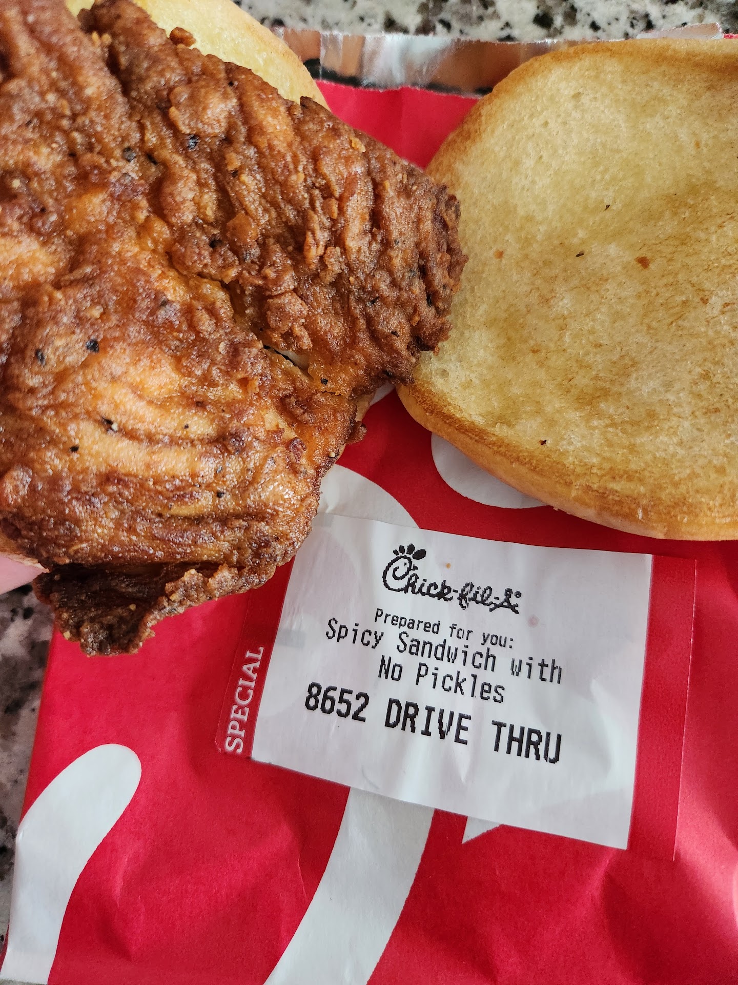 Making our way through the left side of the building took another five or so minutes. Not that big a deal as my daughter and I spoke about what a busy location this was. This Chick-fil-A is a true double drive-thru with windows on both sides of the building. Not realizing this at first, I ended up on the left side of the building and had to reach across my vehicle to the passenger window. Not a big deal - just figured I would mention it.