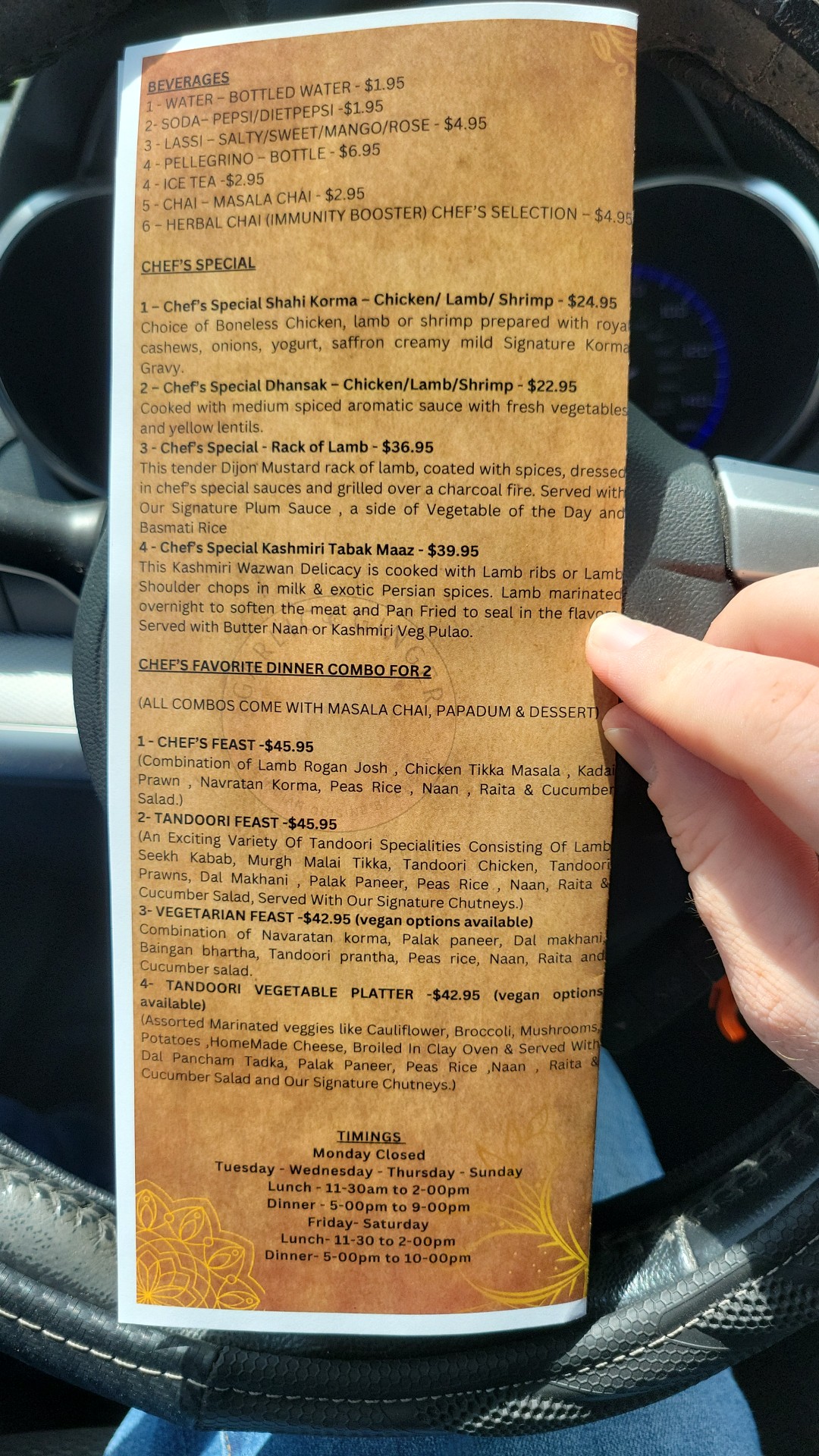 Read moreYum :) I assumed I would not like Indian cuisine but I was wrong! Upon first entering the restaurant, we were greeted with a wonderful aroma. We were seated promptly and brought water and menus. The menu is expansive and almost overwhelming. There were many enticing choices. I could visit there dozens of times and never have the same meal twice. I ordered tomato shorba soup and panak paneer with cheese. My honey ordered a green salad, lamb kabobs, and garlic naan. They didn't seem to offer regular salad dressing. The server brought us a mint sauce. Not sure if that was the case or if there was a language barrier.