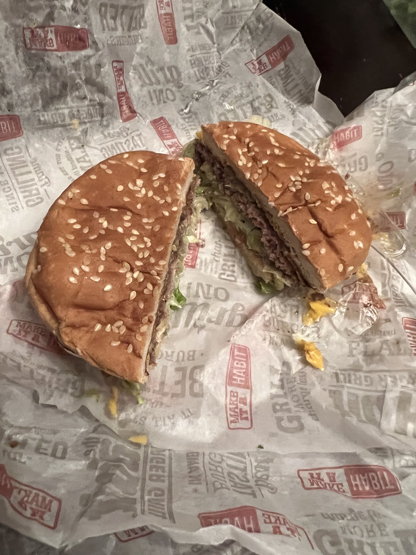 My husband opted for the Chicken Club, featuring a marinated chicken breast, lettuce, tomatoes, hickory-smoked bacon, avocado, and mayo on toasted sourdough. I kept an eye on his reaction, eagerly asking for his honest opinion. He devoured it so quickly that I didn't manage to snap a picture, much like my fries during the 20-minute ride home, haha. He commented that his club was delicious and that he would happily dine at Habit Burger...