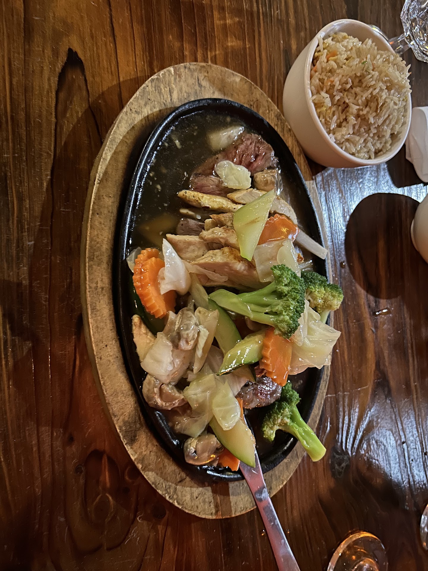 The entrées we felt like could have been better. My husband got the hibachi steak and chicken. He said the steak was tender, until you start chewing into it, it then felt grainy. I got the lobster and chicken. The lobster was extremely tough. I was hesitant to order it because it was a new restaurant for me, and I know that lobster is a difficult thing to prepare. It had a little bit of a bitter taste, which made me worried. Although I thought maybe it was just the seasonings they used. The cabbage was also bitter, kind of tasting like maybe it was from the centerpiece of the cabbage. We spent $74 for everything, and we just felt like for the price it definitely could have been better. We really enjoyed the dimmed lighting in the restaurant, that part was really calming. Everyone seemed pretty happy that was working there, and again we had...